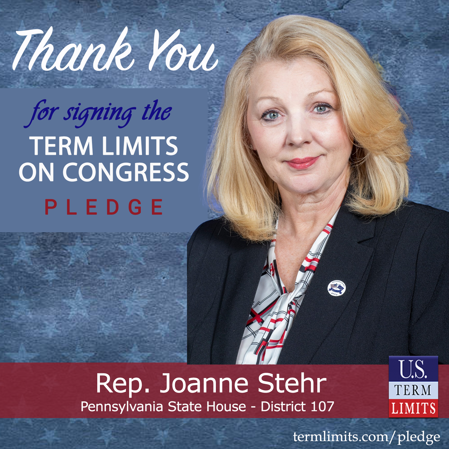 Hegins, PA – U.S. Term Limits (USTL), the leader in the national, non-partisan movement to limit terms for elected officials, is gathering support from state lawmakers across the nation. Its mission is to get 34 states to apply for an amendment proposal convention specific to term limits on Congress. 2025 Pennsylvania state house Rep. Joanne Stehr (district 107), has committed support for term limits on Congress by signing the term limits convention pledge.