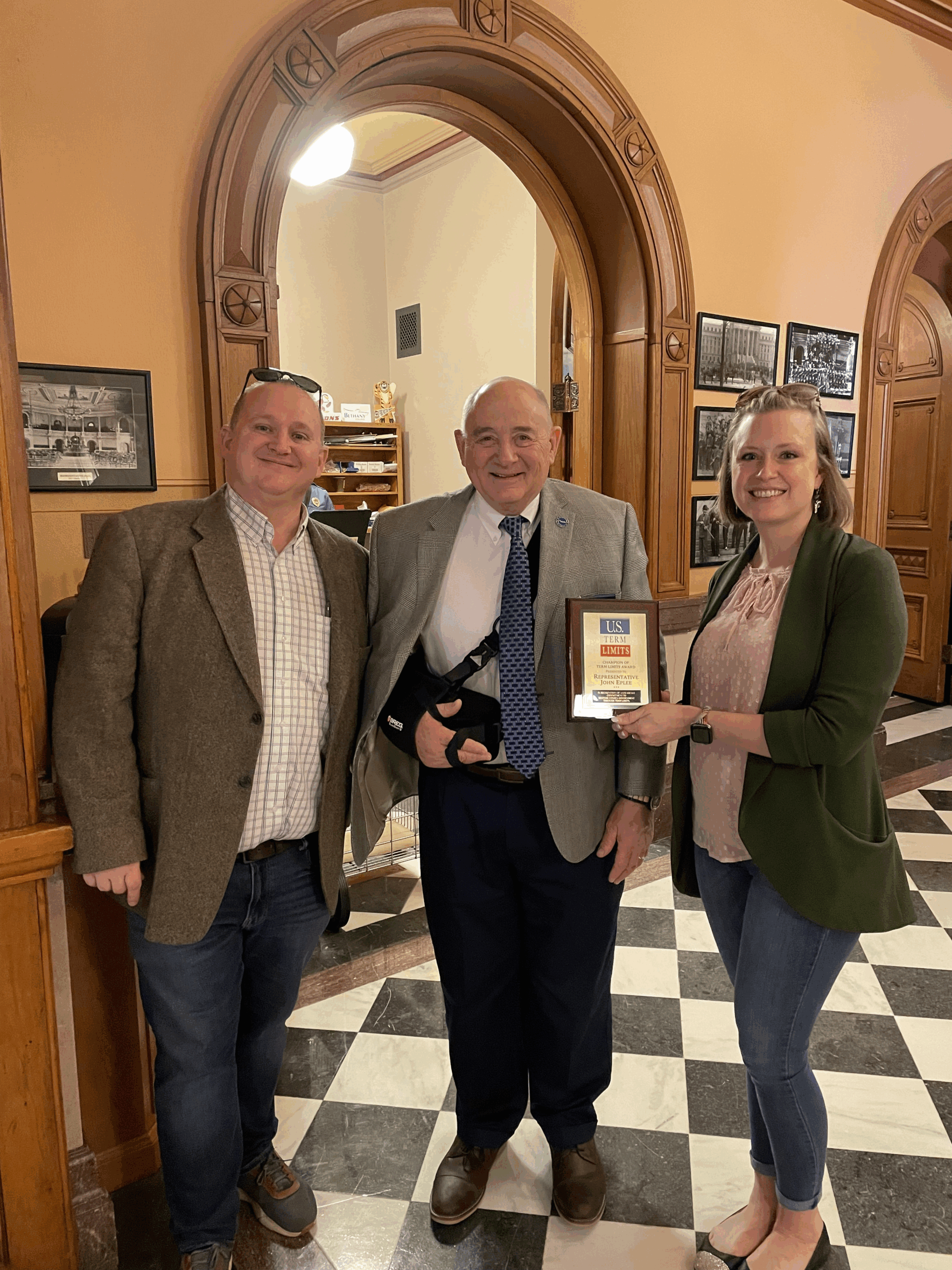 U.S. Term Limits presented Representative Eplee with the “Champion of Term Limits” plaque, which reads, “In recognition of a steadfast commitment to restore citizen government through term limits.” The U.S. Term Limits Article V convention application is limited to proposing an amendment to set a limit on the number of terms that a person may be elected as a member of the U.S. House and Senate. The Article V convention application does not specify the number of terms as that will be determined by the commissioners appointed to the convention by the state legislatures.