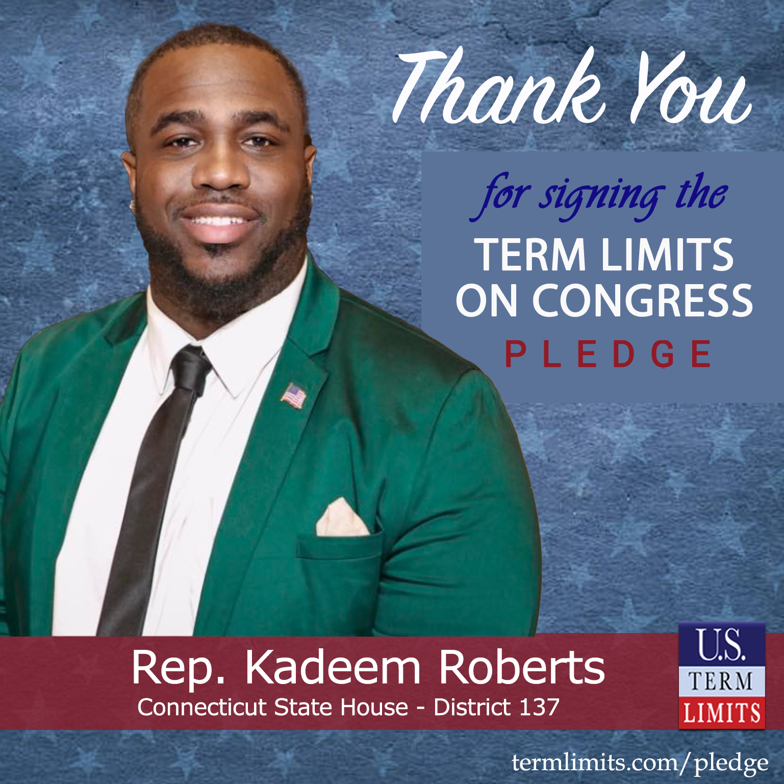 USTL President, Philip Blumel, commented on Roberts’s pledge saying, “Kadeem’s strong support of term limits shows that there are individuals who are willing to listen to the majority of voters who want term limits. America needs a Congress that will be served by citizen legislators, not career politicians.”