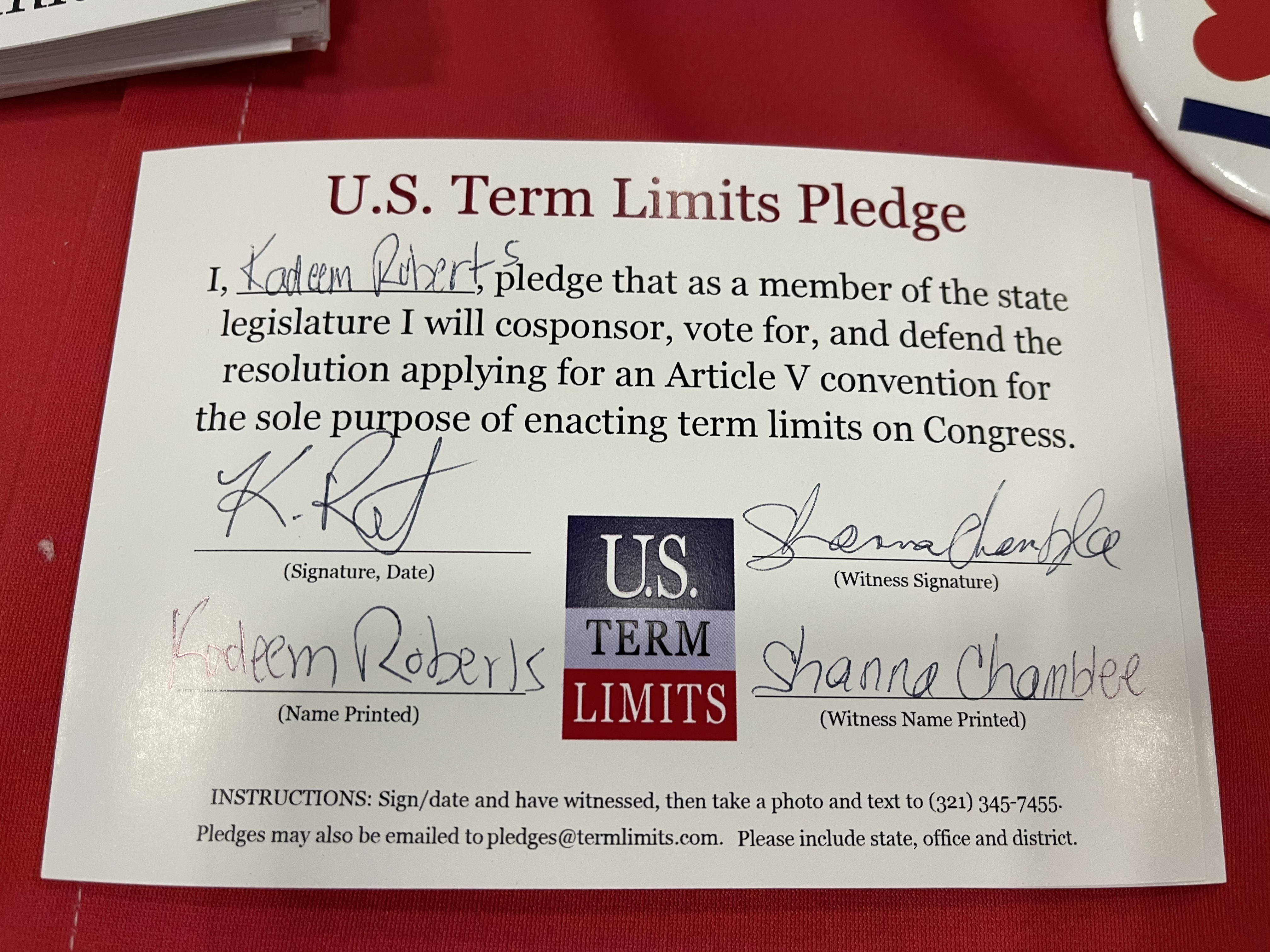 The U.S. Term Limits pledge is provided to candidates and members of state legislatures. It reads, “I pledge that, as a member of the state legislature, I will cosponsor, vote for, and defend the resolution applying for an Article V convention for the sole purpose of enacting term limits on Congress.”