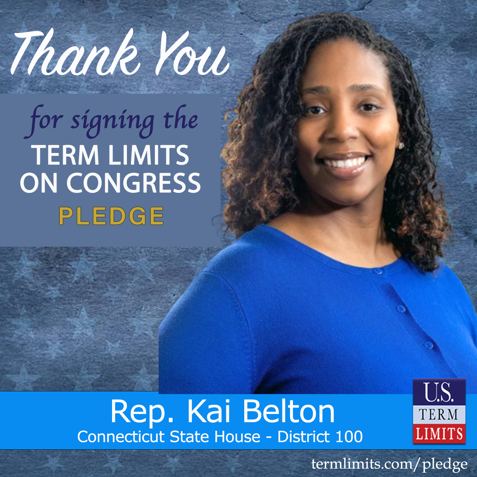 Middletown, CT – U.S. Term Limits (USTL), the leader in the national, non-partisan movement to limit terms for elected officials, is gathering support from state lawmakers across the nation. Its mission is to get 34 states to apply for an amendment proposal convention specific to term limits on Congress. 2025 Connecticut state house Rep. Kai Belton (district 100), has committed support for term limits on Congress by signing the term limits convention pledge.