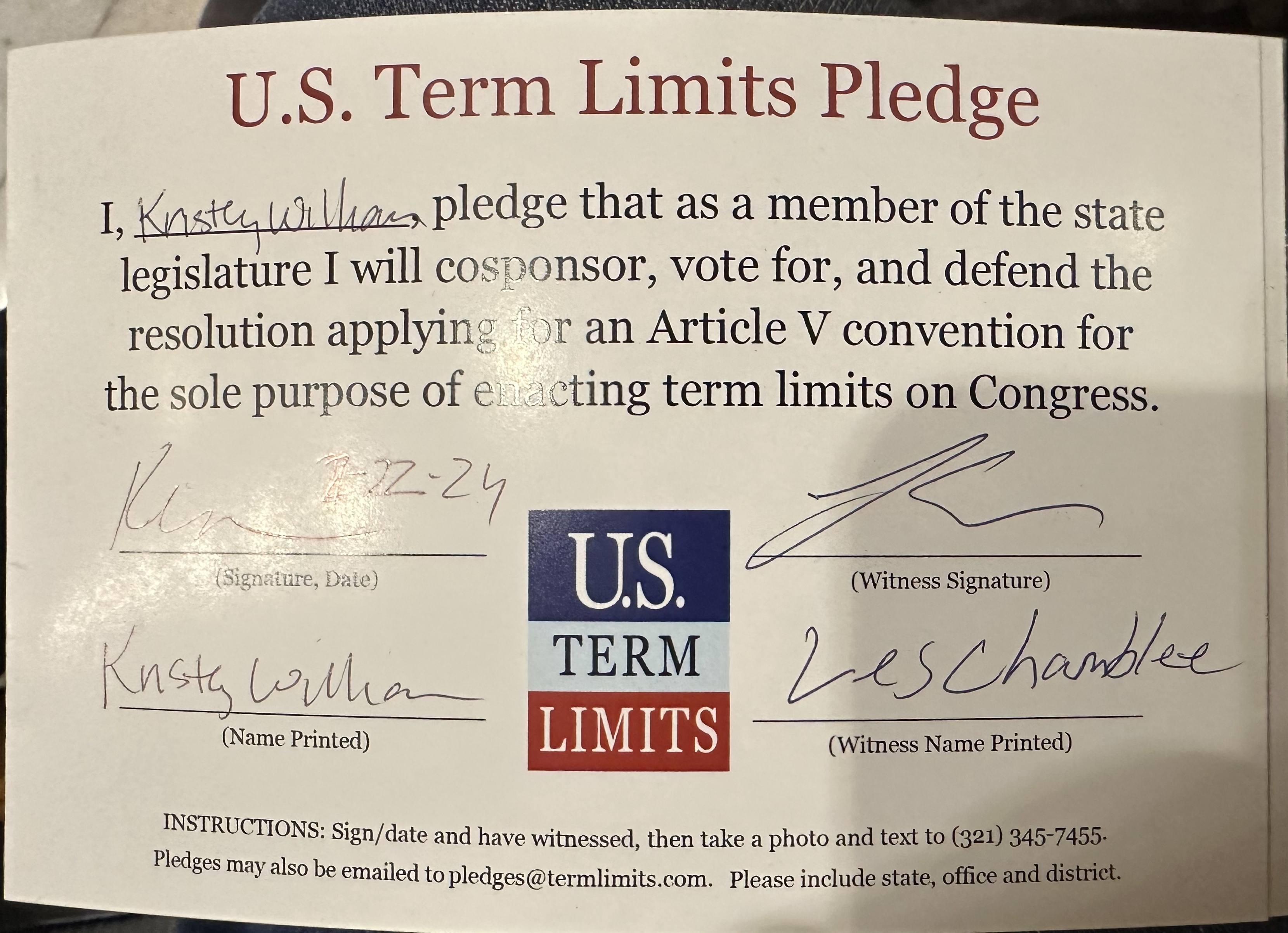 Rep. Kristey Williams Pledges to Support Congressional Term Limits
