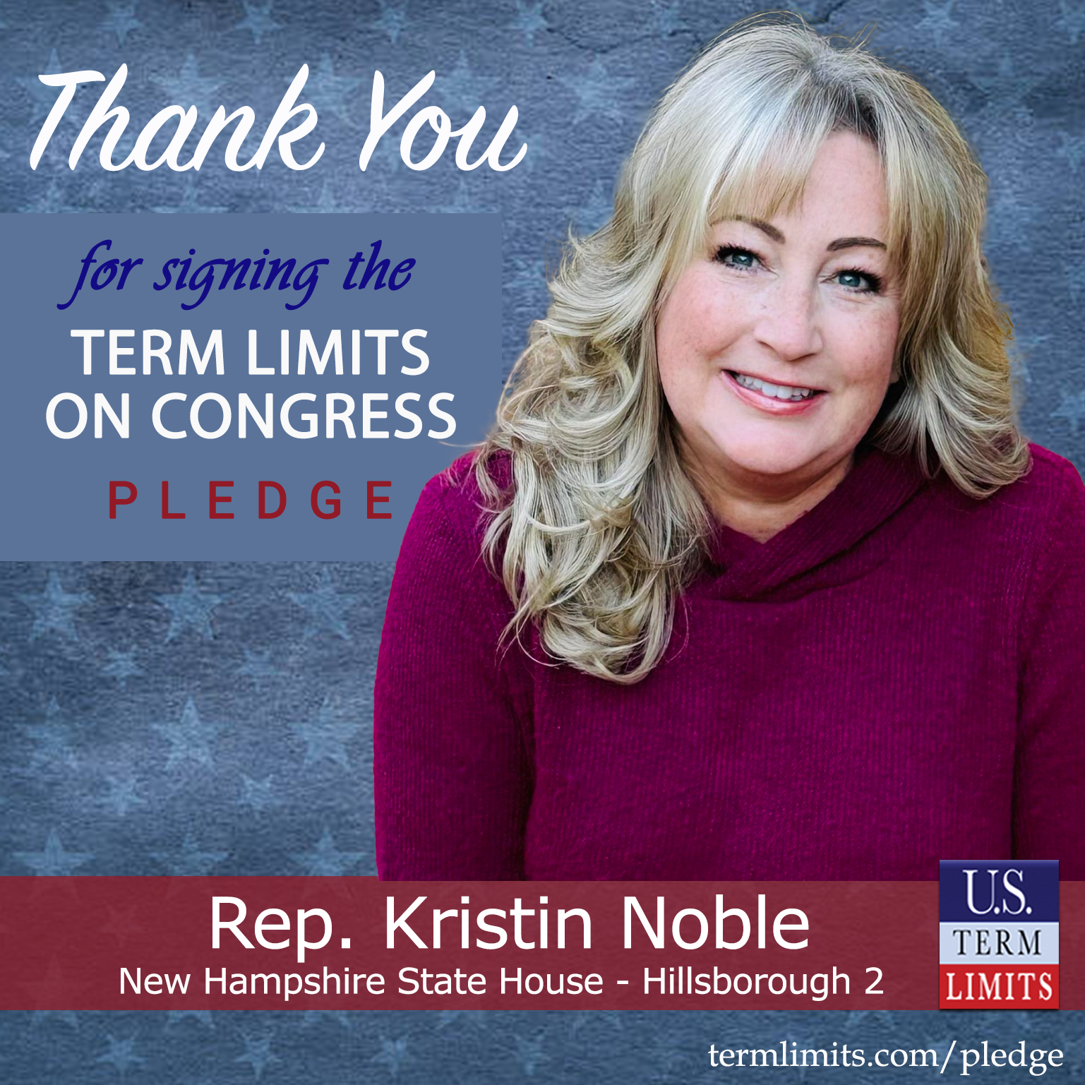 Bedford, NH – U.S. Term Limits (USTL), the leader in the national, non-partisan movement to limit terms for elected officials, is gathering support from state lawmakers across the nation. Its mission is to get 34 states to apply for an amendment proposal convention specific to term limits on Congress. 2025 New Hanpshire state house Rep. Kristin Noble (Hillsborough 2), has committed support for term limits on Congress by signing the term limits convention pledge.