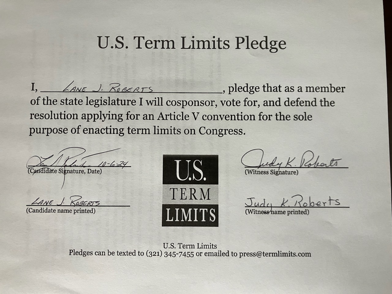 Rep. Lane Roberts Pledges to Support Congressional Term Limits