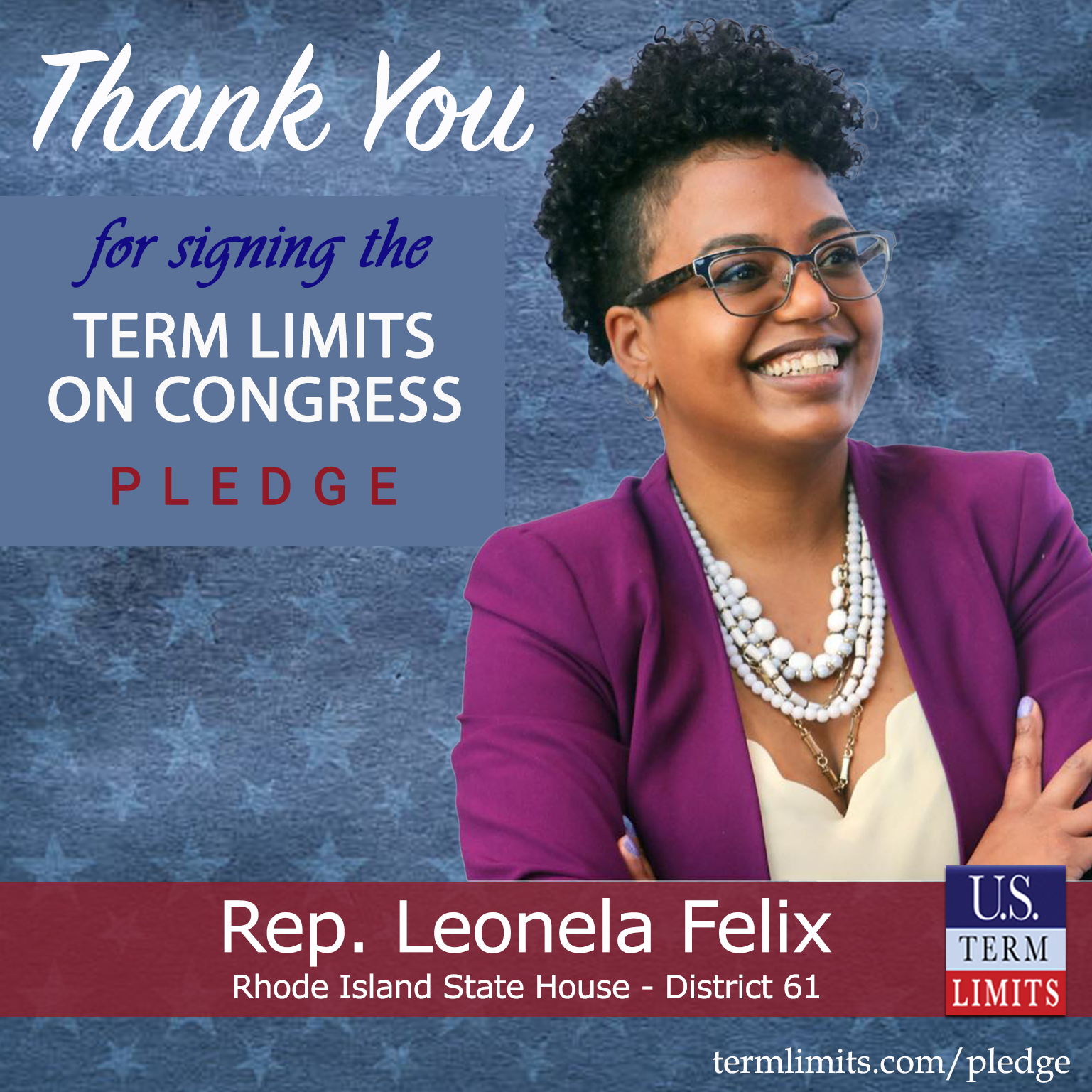 Pawtucket, RI – U.S. Term Limits (USTL), the leader in the national, non-partisan movement to limit terms for elected officials, is gathering support from state lawmakers across the nation. Its mission is to get 34 states to apply for an amendment proposal convention specific to term limits on Congress. Rhode Island state house Rep. Leonela Felix (district 61), has committed support for term limits on Congress by signing the term limits convention pledge.