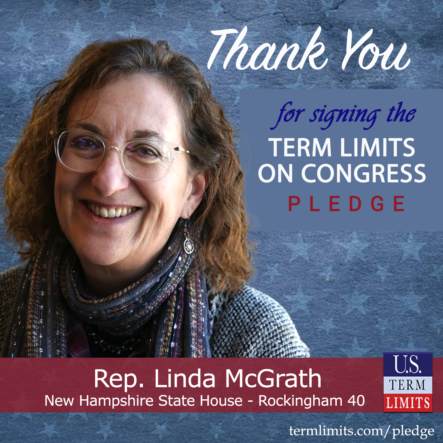 Hampton, NH  – U.S. Term Limits (USTL), the leader in the national, non-partisan movement to limit terms for elected officials, is gathering support from state lawmakers across the nation. Its mission is to get 34 states to apply for an amendment proposal convention specific to term limits on Congress. 2025 New Hampshire state house Rep. Linda McGrath (Rockingham 40), has committed support for term limits on Congress by signing the term limits convention pledge.