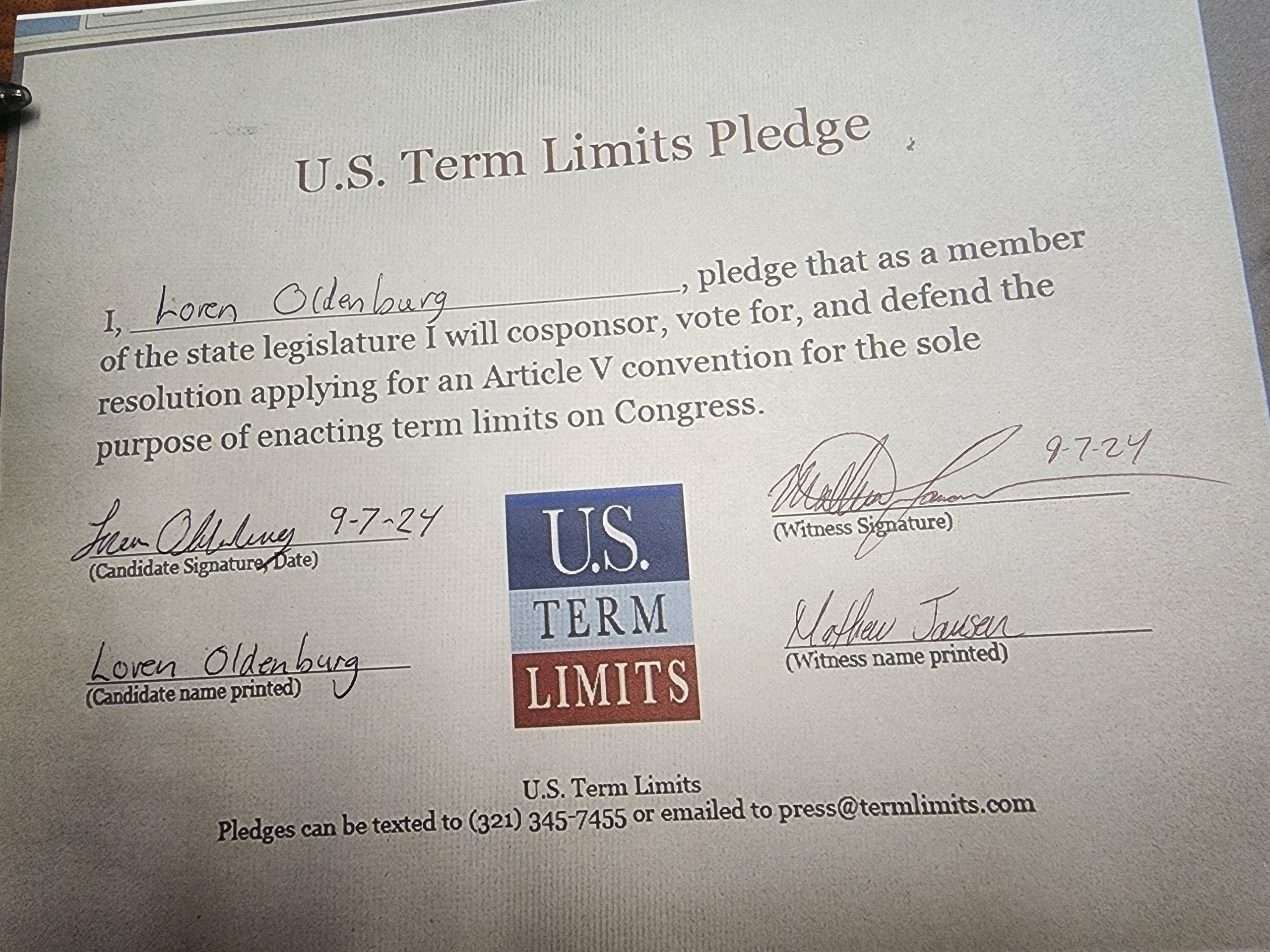 Rep. Loren Oldenburg Pledges to Support Congressional Term Limits