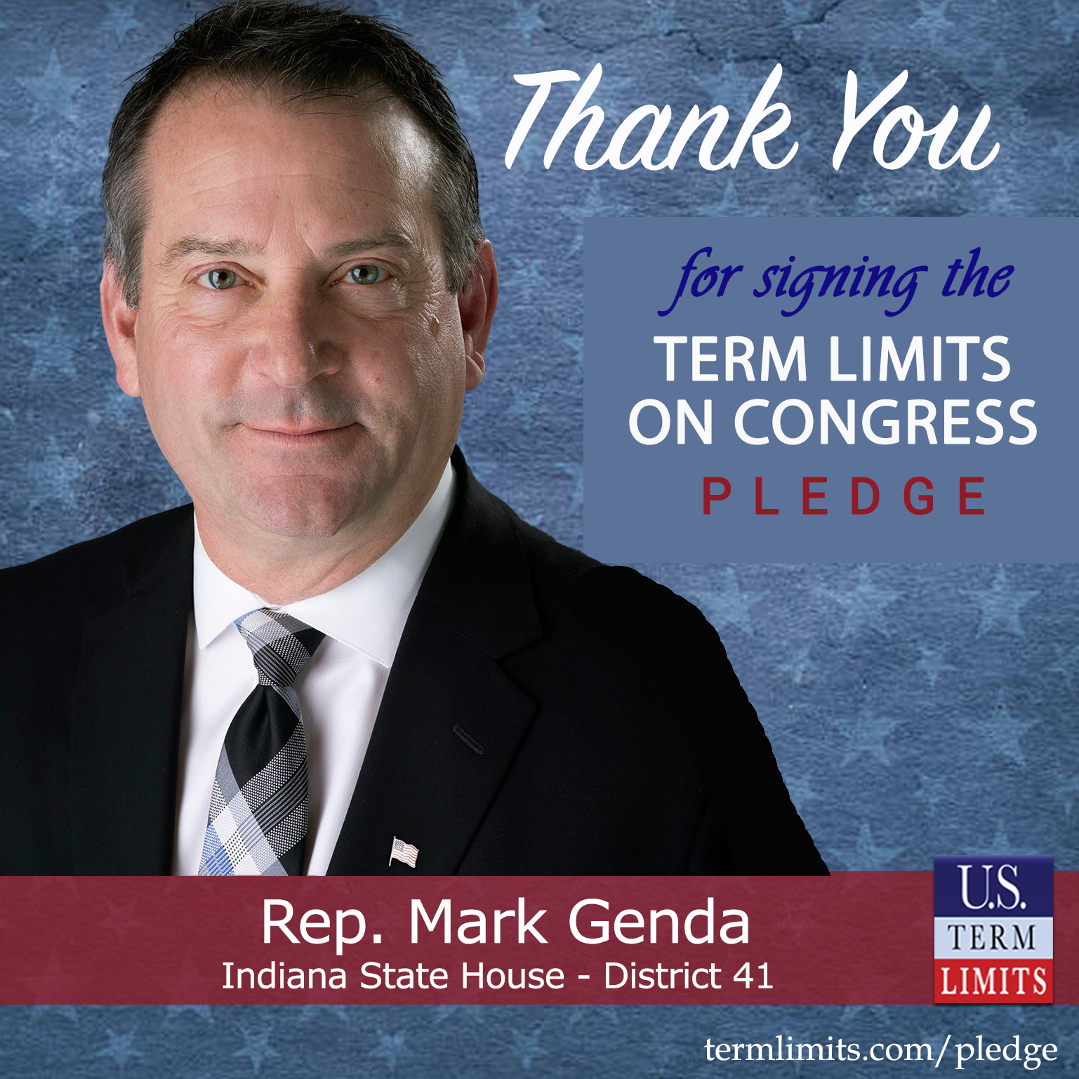 Thorntown, IN – U.S. Term Limits (USTL), the leader in the national, non-partisan movement to limit terms for elected officials, is gathering support from state lawmakers across the nation. Its mission is to get 34 states to apply for an amendment proposal convention specific to term limits on Congress. 2025 Indiana state house Rep. Mark Genda (district 41), has committed support for term limits on Congress by signing the term limits convention pledge.