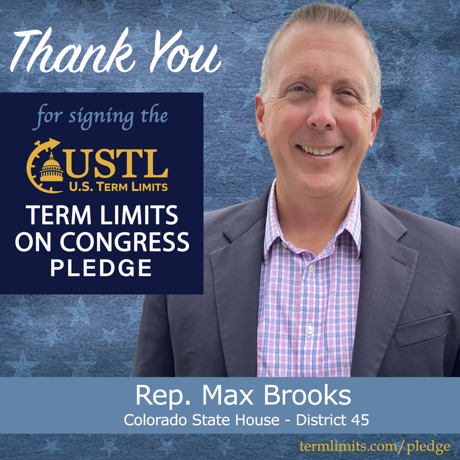 Castle Rock, CO – U.S. Term Limits (USTL), the leader in the national, non-partisan movement to limit terms for elected officials, is gathering support from state lawmakers across the nation. Its mission is to get 34 states to apply for an amendment proposal convention specific to term limits on Congress. Colorado state house Rep. Max Brooks (district 45), has committed support for term limits on Congress by signing the term limits convention pledge.