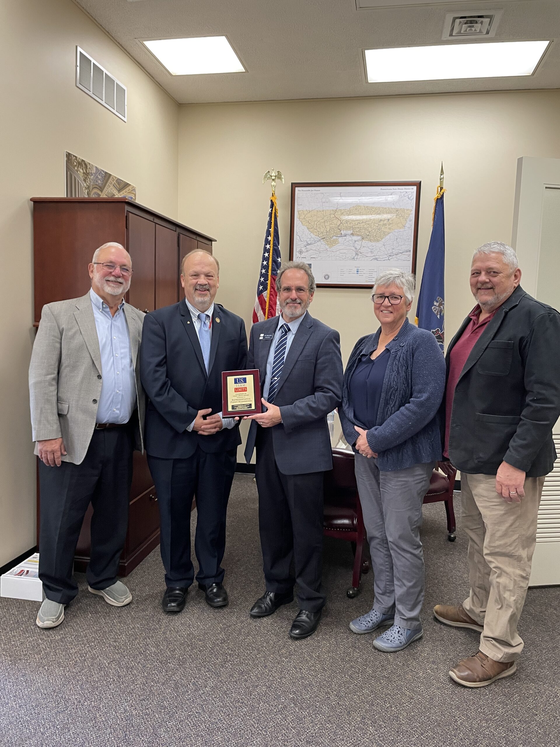 Several volunteers joined Kenn Quinn of U.S. Term Limits to present Representative Stambaugh the “Champion of Term Limits” plaque, which reads, “In recognition of a steadfast commitment to restore citizen government through term limits.” The U.S. Term Limits Article V convention application is limited to proposing an amendment to set a limit on the number of terms that a person may be elected as a member of the U.S. House and Senate. The Article V convention application does not specify the number of terms as that will be determined by the commissioners appointed to the convention by the state legislatures.