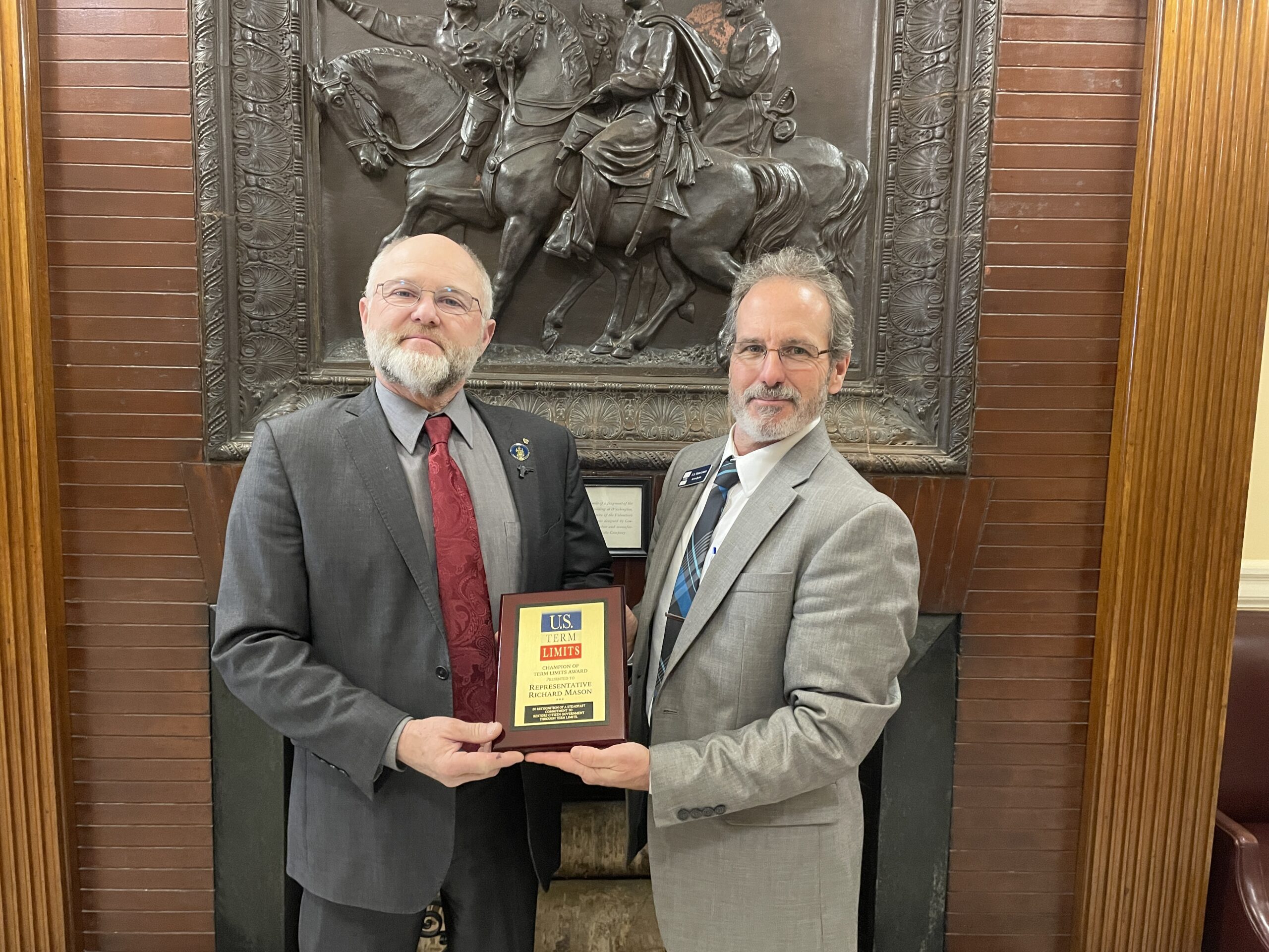 Kenn Quinn of U.S. Term Limits presented Representative Mason the “Champion of Term Limits” plaque, which reads, “In recognition of a steadfast commitment to restore citizen government through term limits.” The U.S. Term Limits Article V convention application is limited to proposing an amendment to set a limit on the number of terms that a person may be elected as a member of the U.S. House and Senate. The Article V convention application does not specify the number of terms as that will be determined by the commissioners appointed to the convention by the state legislatures.