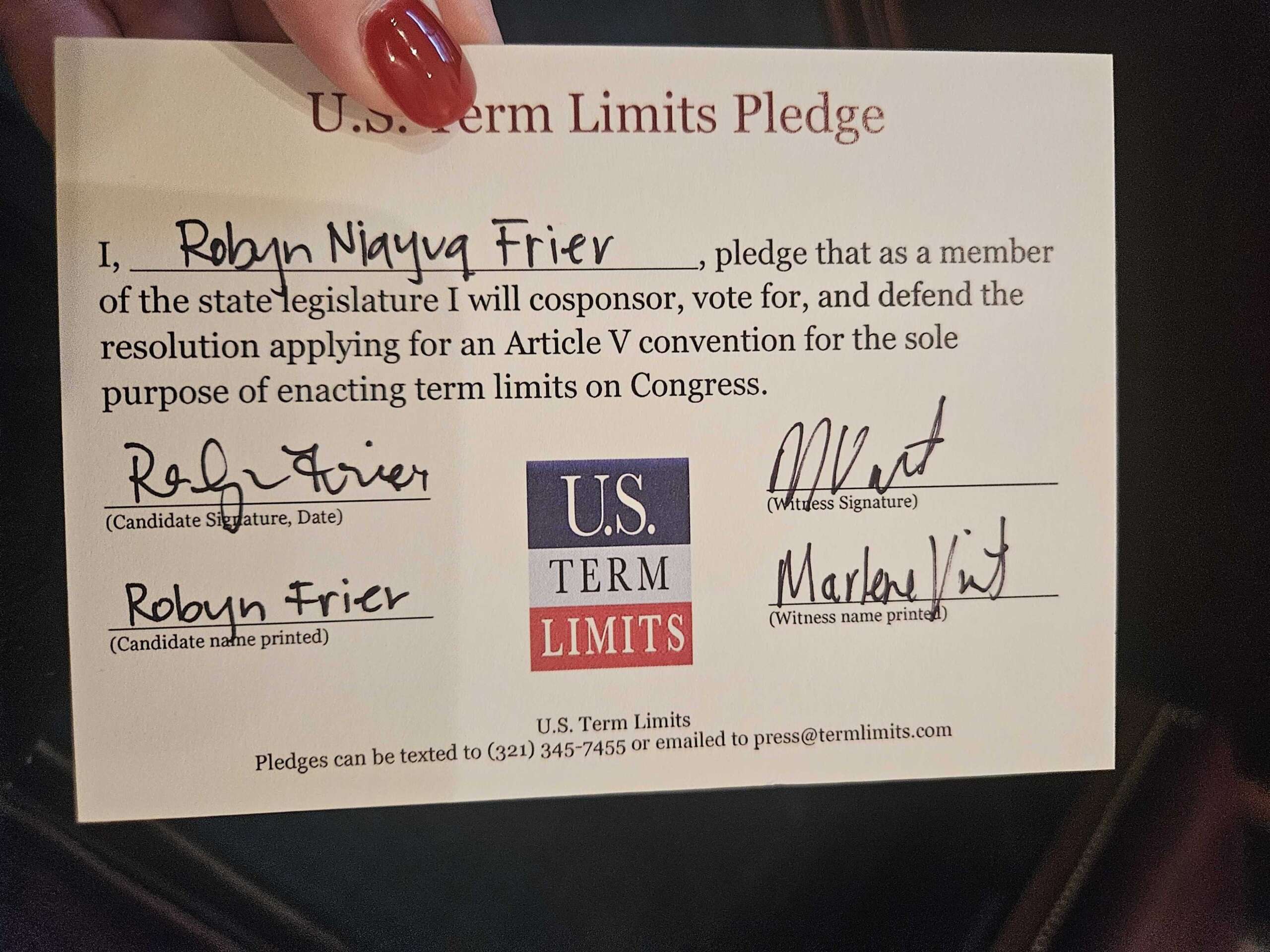 Rep. Robyn Niayuq Frier Pledges to Support Congressional Term Limits