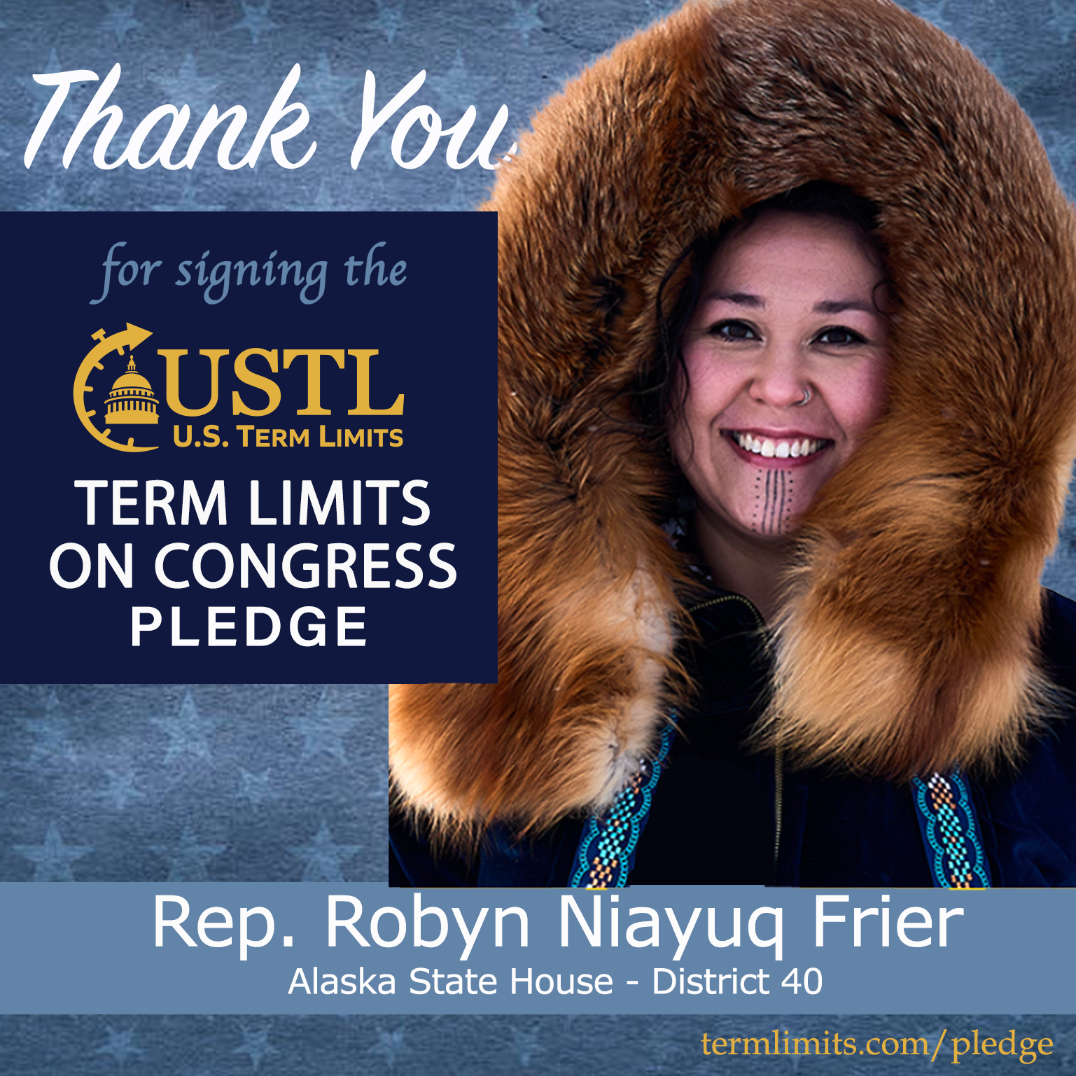 Point Hope, AK – U.S. Term Limits (USTL), the leader in the national, non-partisan movement to limit terms for elected officials, is gathering support from state lawmakers across the nation. Its mission is to get 34 states to apply for an amendment proposal convention specific to term limits on Congress. Alaska state Rep. Robyn Niayuq Frier (district 40), has committed support for term limits on Congress by signing the term limits convention pledge.
