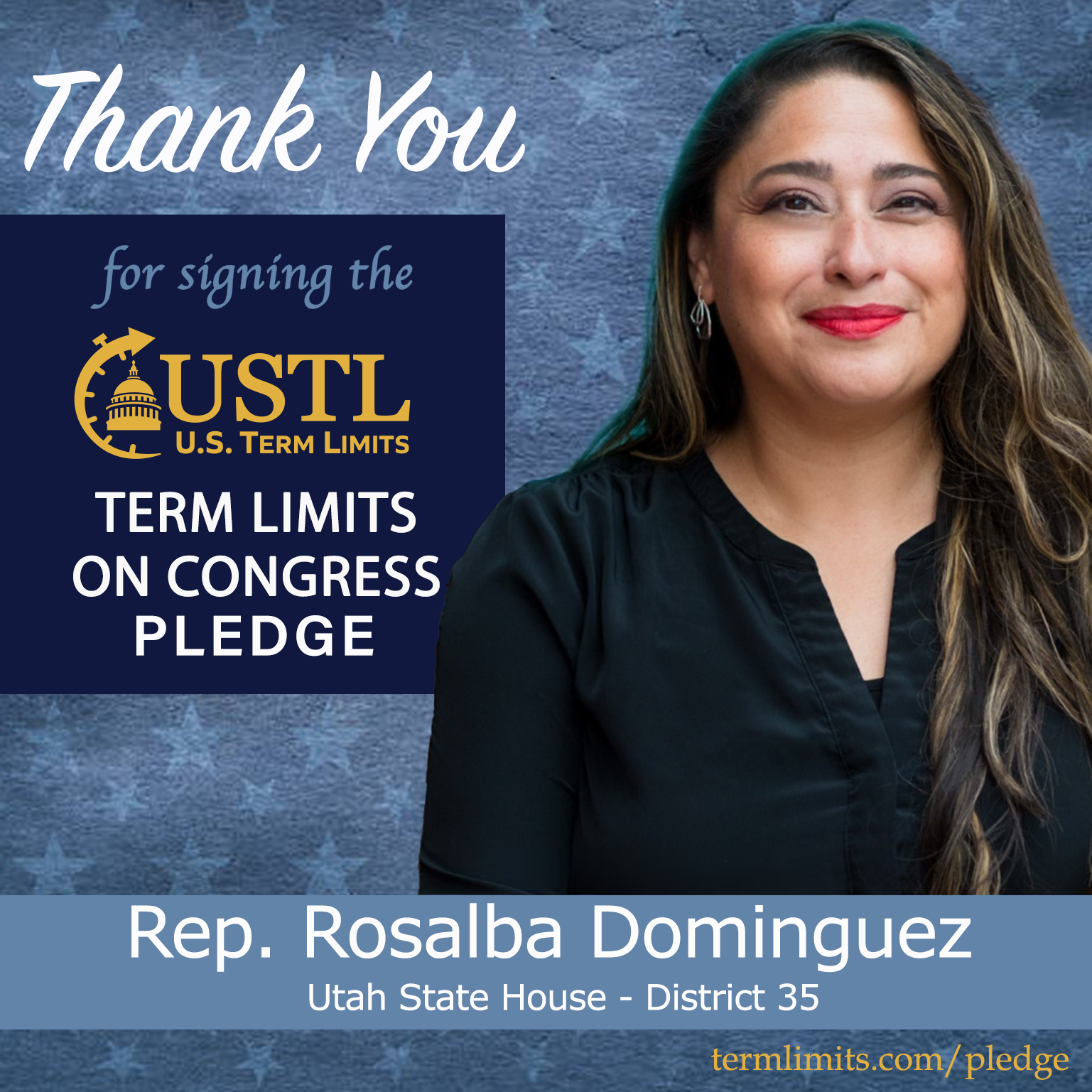 Salt Lake City, UT – U.S. Term Limits (USTL), the leader in the national, non-partisan movement to limit terms for elected officials, is gathering support from state lawmakers across the nation. Its mission is to get 34 states to apply for an amendment proposal convention specific to term limits on Congress. Utah state house Rep. Rosalba Dominguez (district 35), has committed support for term limits on Congress by signing the term limits convention pledge.