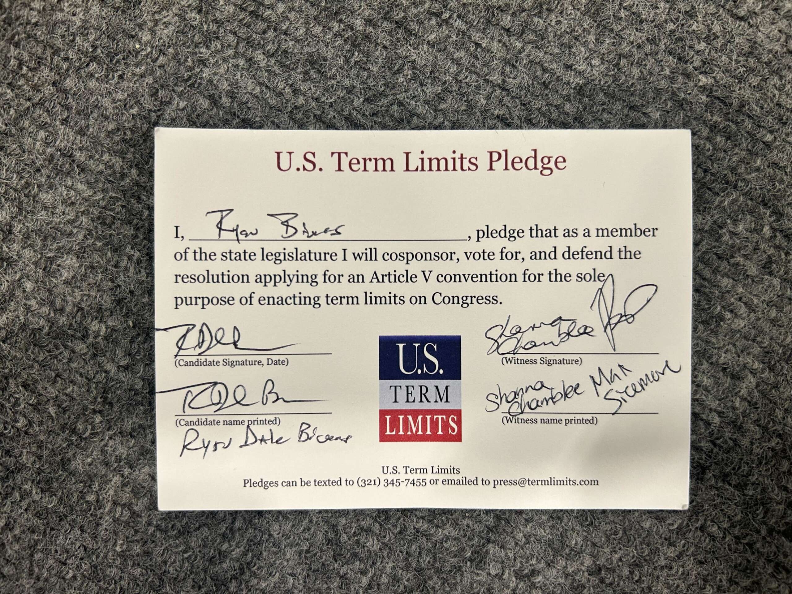 The U.S. Term Limits pledge is provided to candidates and members of state legislatures. It reads, “I pledge that, as a member of the state legislature, I will cosponsor, vote for, and defend the resolution applying for an Article V convention for the sole purpose of enacting term limits on Congress.”