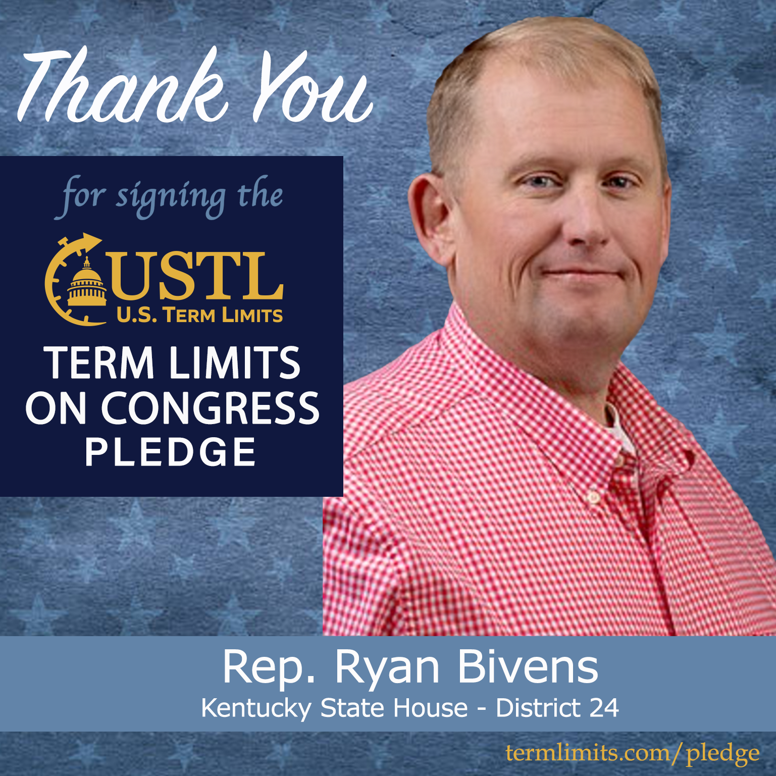 Campbellsville, KY – U.S. Term Limits (USTL), the leader in the national, non-partisan movement to limit terms for elected officials, is gathering support from state lawmakers across the nation. Its mission is to get 34 states to apply for an amendment proposal convention specific to term limits on Congress. Kentucky state house Rep. Ryan Bivens (district 24), has committed support for term limits on Congress by signing the term limits convention pledge.