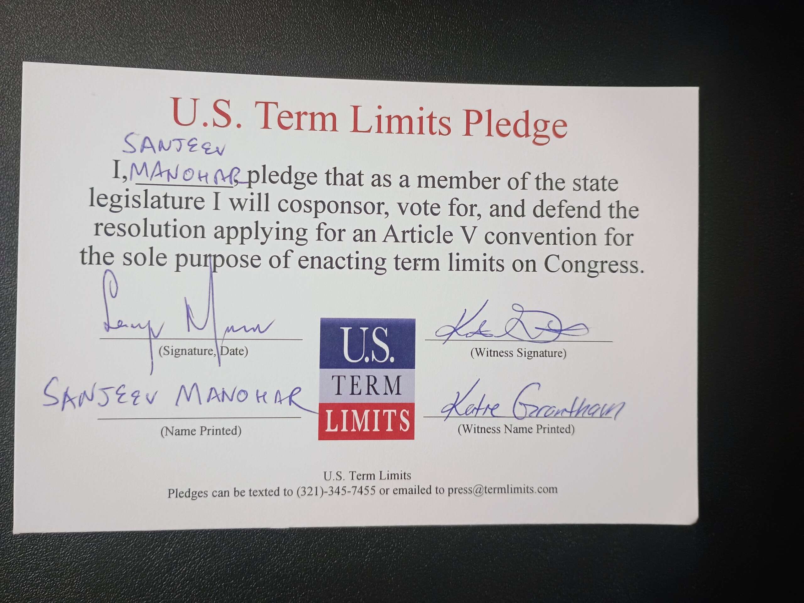 The U.S. Term Limits pledge is provided to candidates and members of state legislatures. It reads, “I pledge that, as a member of the state legislature, I will cosponsor, vote for, and defend the resolution applying for an Article V convention for the sole purpose of enacting term limits on Congress.”