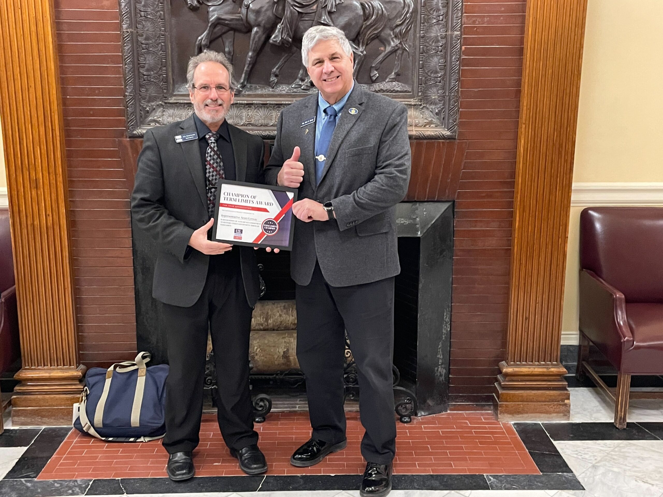 Kenn Quinn of U.S. Term Limits presented Rep. Cyrway the “Champion of Term Limits” plaque, which reads, “In recognition of a steadfast commitment to restore citizen government through term limits.” The U.S. Term Limits Article V convention application is limited to proposing an amendment to set a limit on the number of terms that a person may be elected as a member of the U.S. House and Senate. The Article V convention application does not specify the number of terms as that will be determined by the commissioners appointed to the convention by the state legislatures.