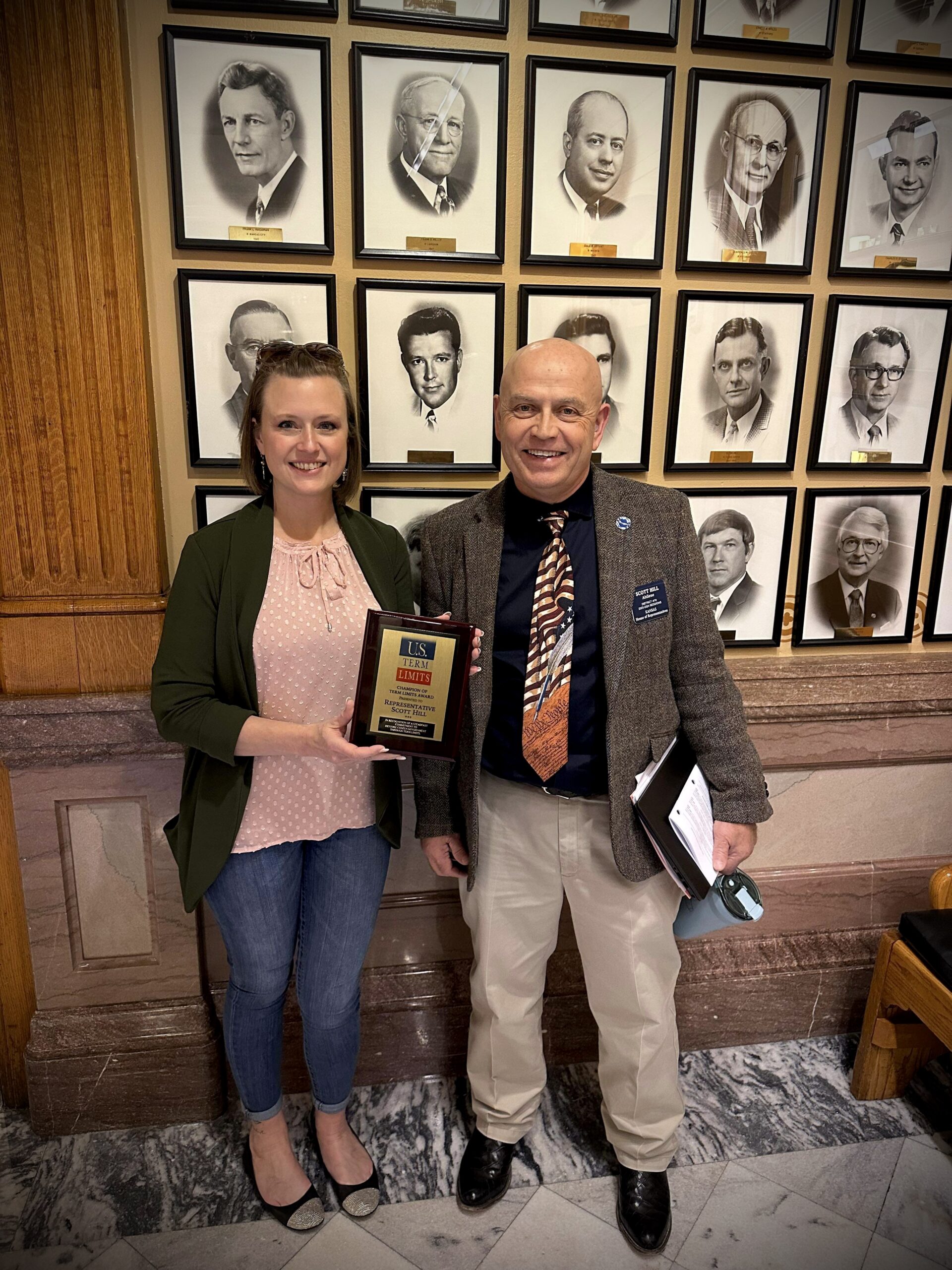 U.S. Term Limits presented Representative Hill with the “Champion of Term Limits” plaque, which reads, “In recognition of a steadfast commitment to restore citizen government through term limits.” The U.S. Term Limits Article V convention application is limited to proposing an amendment to set a limit on the number of terms that a person may be elected as a member of the U.S. House and Senate. The Article V convention application does not specify the number of terms as that will be determined by the commissioners appointed to the convention by the state legislatures.