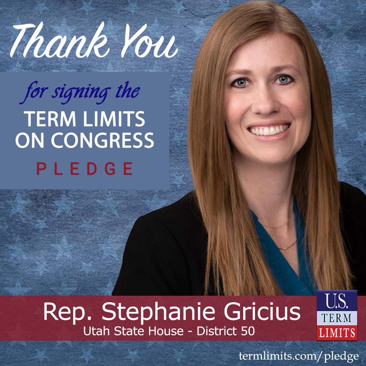 Salt Lake City, UT – U.S. Term Limits (USTL), the leader in the national, non-partisan movement to limit terms for elected officials, is gathering support from state lawmakers across the nation. Its mission is to get 34 states to apply for an amendment proposal convention specific to term limits on Congress. 2025 Utah state house Rep. Stephanie Gricius (district 50), has committed support for term limits on Congress by signing the term limits convention pledge.