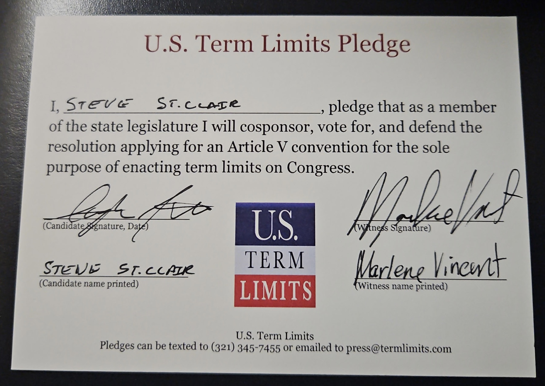 Rep. Steve St. Clair Pledges to Support Congressional Term Limits