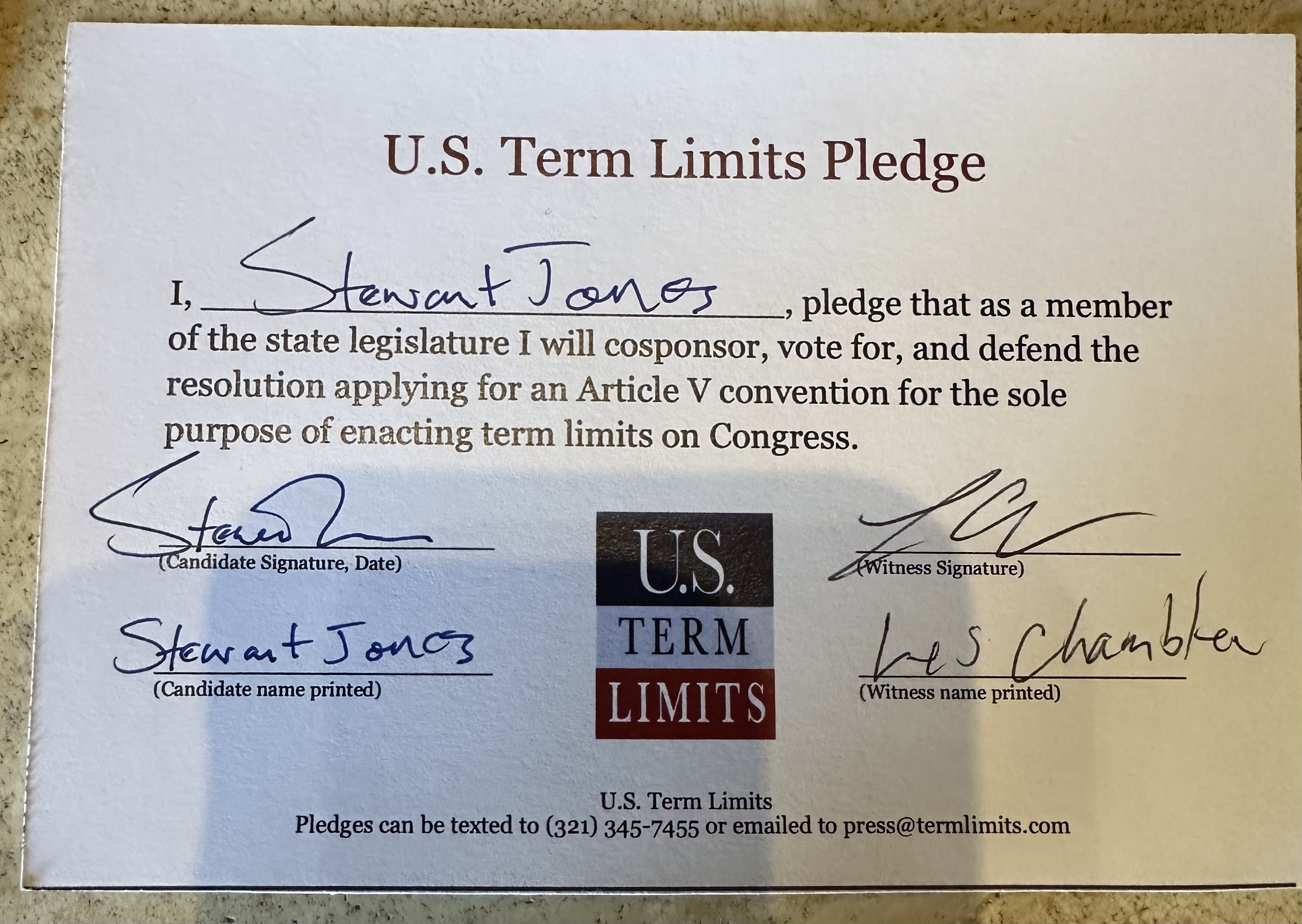 Rep. Stewart Jones Pledges to Support Congressional Term Limits