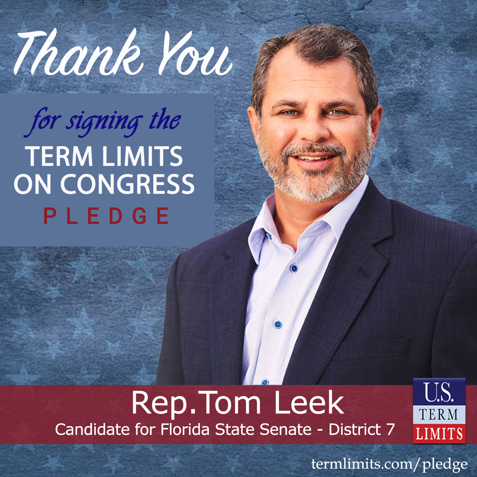 Palm Coast, FL – U.S. Term Limits (USTL), the leader in the national, non-partisan movement to limit terms for elected officials, is gathering support from state lawmakers across the nation. Its mission is to get 34 states to apply for an amendment proposal convention specific to term limits on Congress. Florida state senate candidate for district 7, Rep. Tom Leek, has committed support for term limits on Congress by signing the term limits convention pledge.