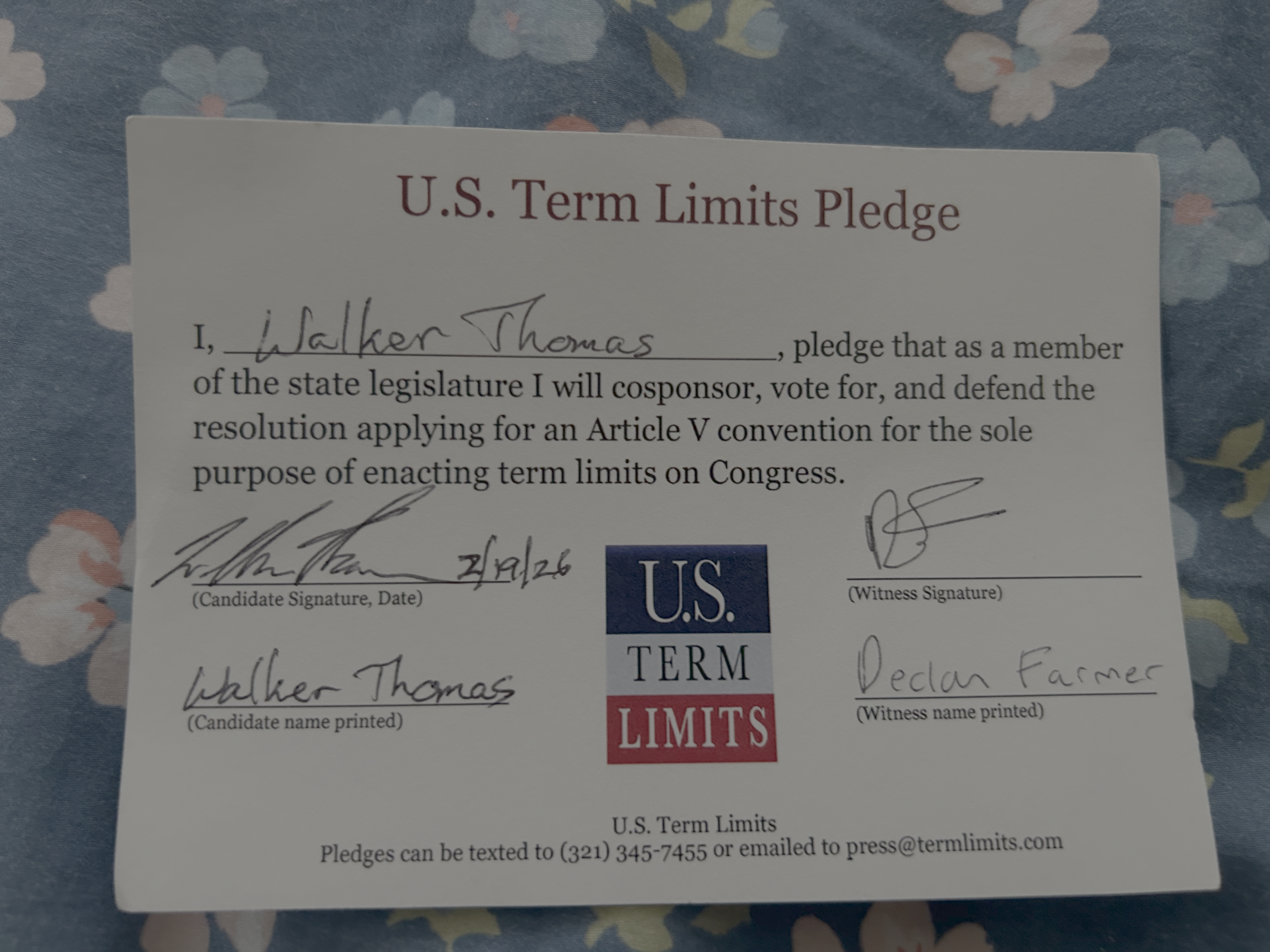 Rep. Walker Thomas Pledges to Support Congressional Term Limits