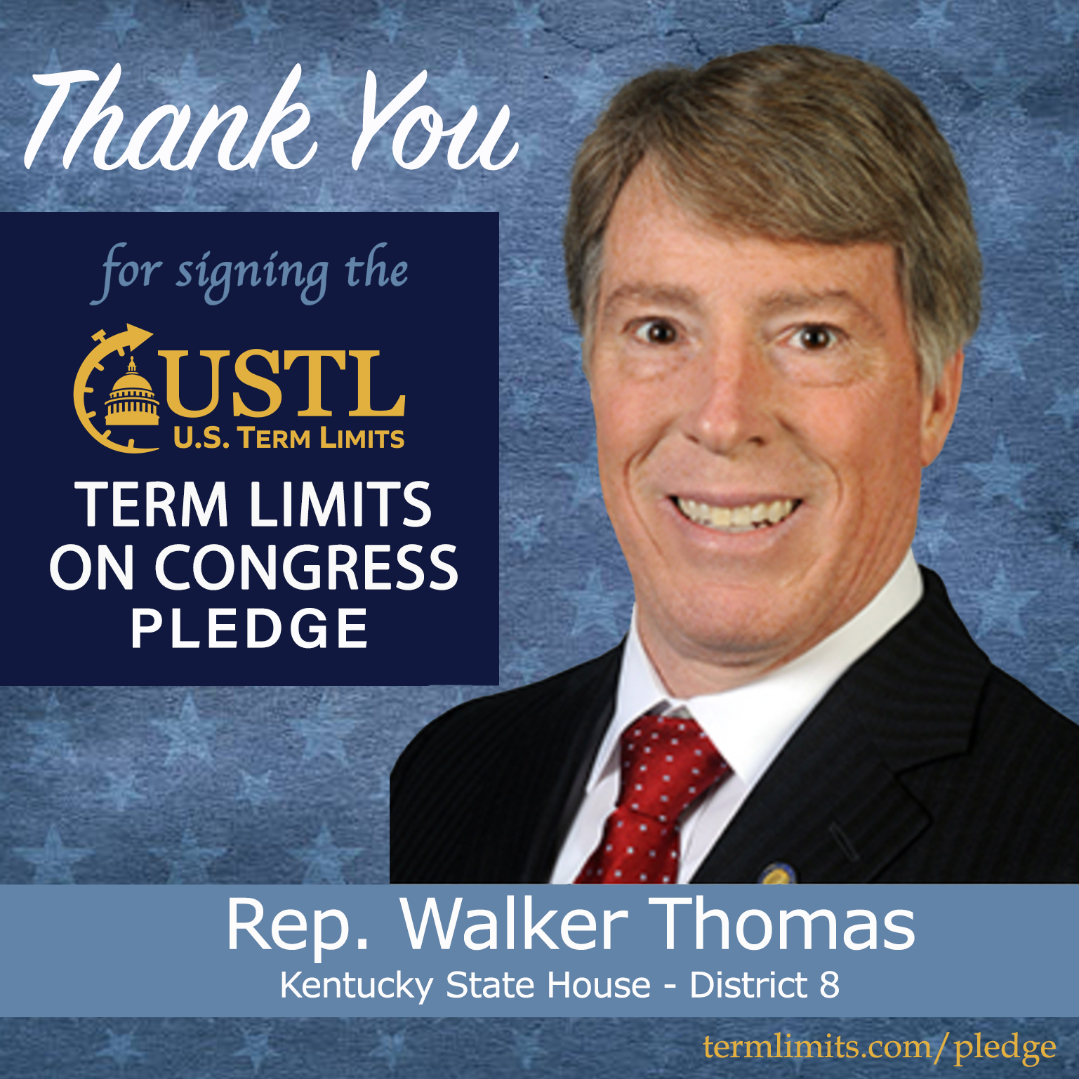 Hopkinsville, KY – U.S. Term Limits (USTL), the leader in the national, non-partisan movement to limit terms for elected officials, is gathering support from state lawmakers across the nation. Its mission is to get 34 states to apply for an amendment proposal convention specific to term limits on Congress. Kentucky state Rep. Walker Thomas (district 8), has committed support for term limits on Congress by signing the term limits convention pledge.