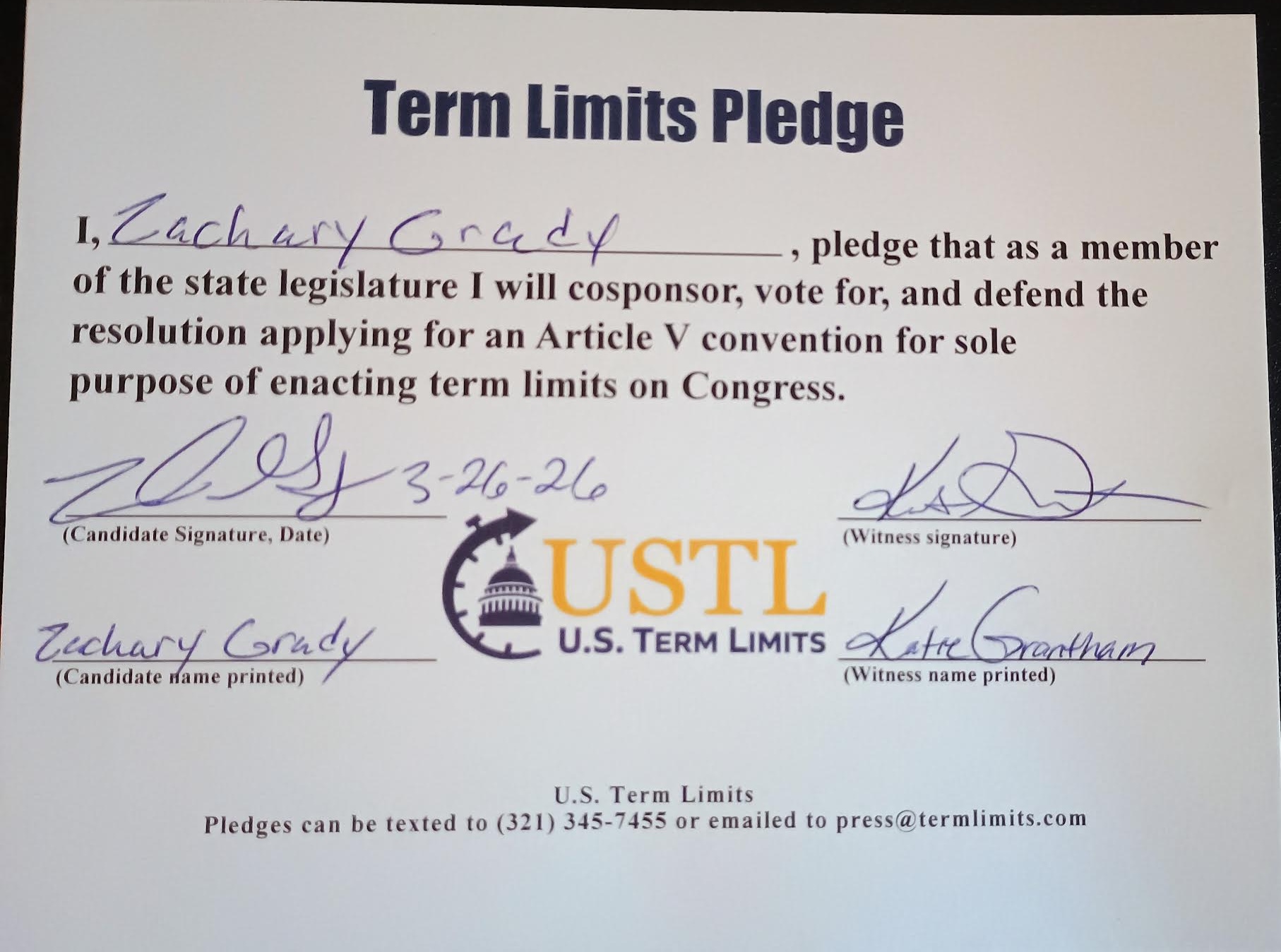D’Iberville, MS – U.S. Term Limits (USTL), the leader in the national, non-partisan movement to limit terms for elected officials, is gathering support from state lawmakers across the nation. Its mission is to get 34 states to apply for an amendment proposal convention specific to term limits on Congress. 2026 Mississippi state house Rep. Zach Grady (district 115), has committed support for term limits on Congress by signing the term limits convention pledge.