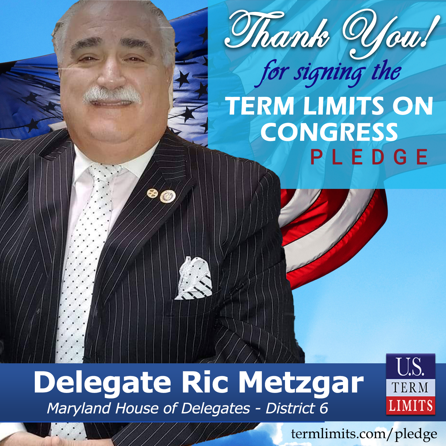 Dundalk, MD – U.S. Term Limits (USTL), the leader in the national, non-partisan movement to limit terms for elected officials, is gathering support from state lawmakers across the nation. Its mission is to get 34 states to apply for an amendment proposal convention specific to term limits on Congress. Maryland state house Delegate, Ric Metzgar (District 6), has committed support for term limits on Congress by signing the term limits convention pledge.