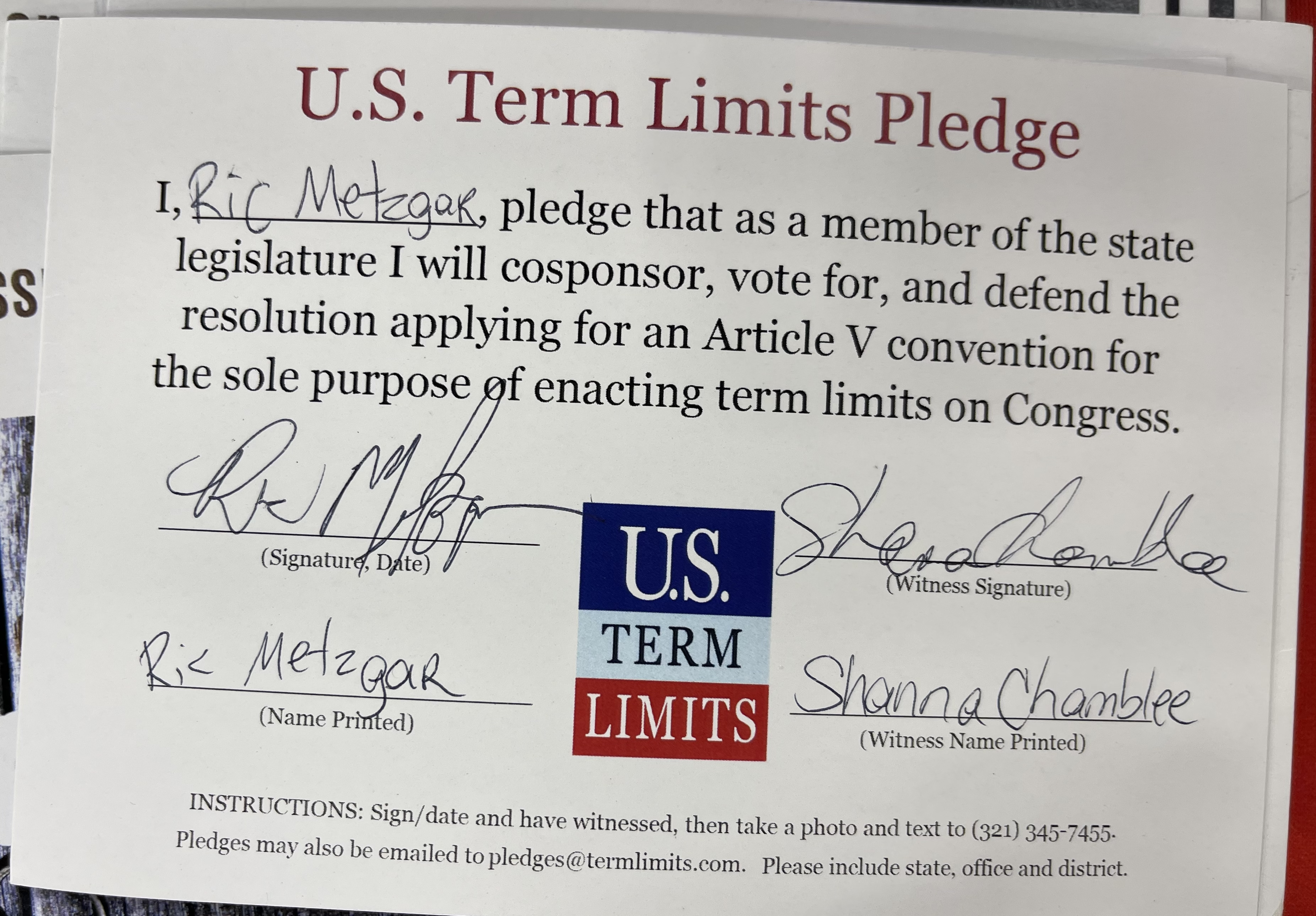 Delegate Ric Metzgar Pledges to Support Congressional Term Limits
