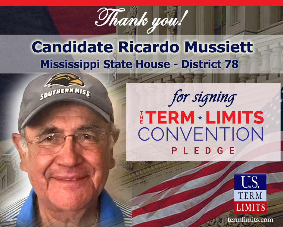 Washington, D.C. – U.S. Term Limits (USTL), the leader in the national, non-partisan movement to limit terms for elected officials, is gathering support from state lawmakers across the nation. Its mission is to get 34 states to apply for an amendment proposal convention specific to term limits on Congress. Mississippi state house candidate Ricardo Mussiett (district 87) is the first person in this race to commit support for term limits on Congress by signing the term limits convention pledge. The primary election will be held August 6, 2019.