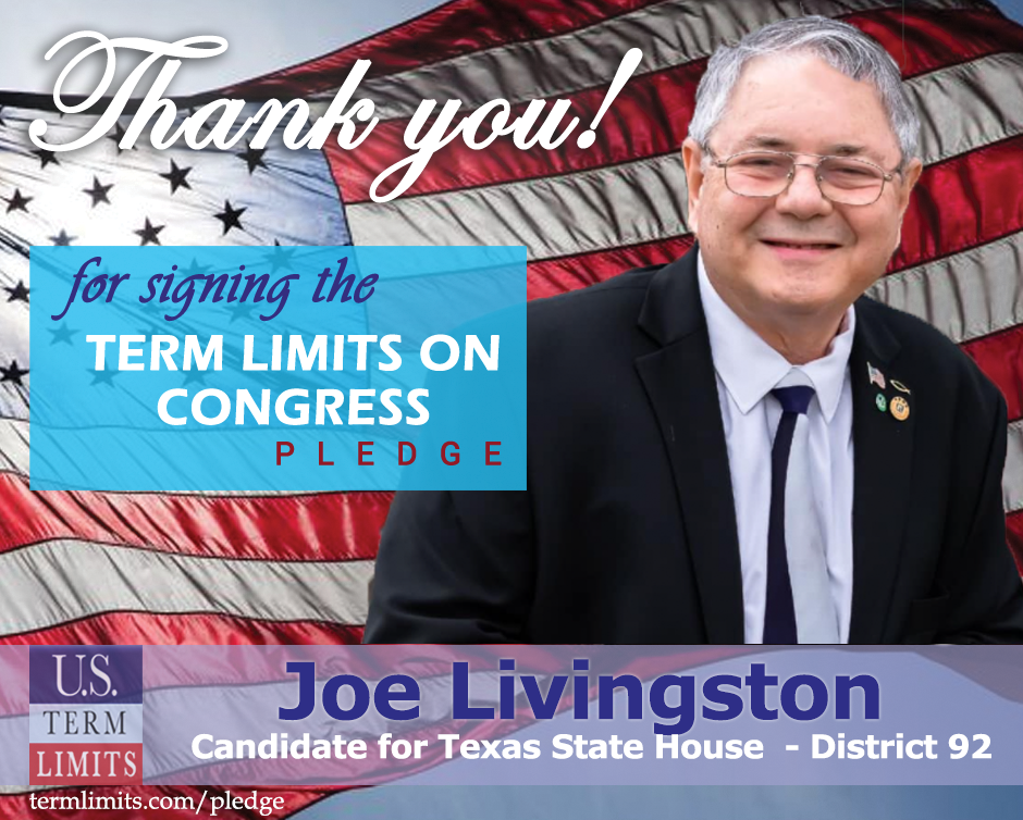 The U.S. Term Limits pledge is provided to candidates and members of state legislatures. It reads, “I pledge that, as a member of the state legislature, I will cosponsor, vote for, and defend the resolution applying for an Article V convention for the limited purpose of enacting term limits on Congress.”