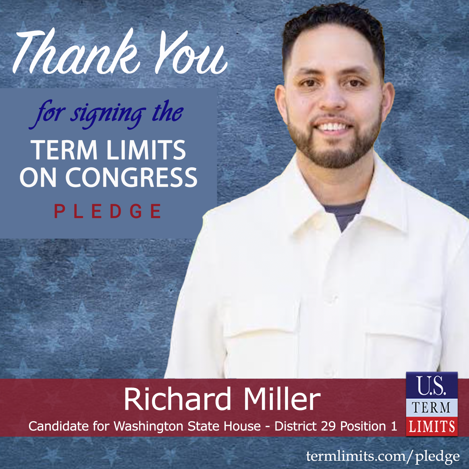 Tacoma, WA – U.S. Term Limits (USTL), the leader in the national, non-partisan movement to limit terms for elected officials, is gathering support from state lawmakers across the nation. Its mission is to get 34 states to apply for an amendment proposal convention specific to term limits on Congress. Washington state house candidate, Richard Miller (District 29 Position 1), has committed support for term limits on Congress by signing the Term Limits Convention Pledge.