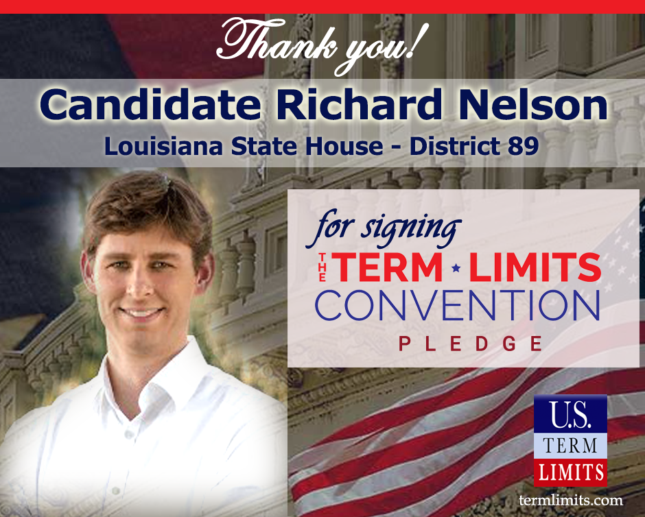 Washington, DC – U.S. Term Limits (USTL), the leader in the national, non-partisan movement to limit terms for elected officials, is gathering support from state lawmakers across the nation. Its mission is to get 34 states to apply for an amendment proposal convention specific to term limits on Congress. Louisiana state house candidate Richard Nelson (district 89) has committed support for term limits on Congress by signing the Term Limits convention pledge.