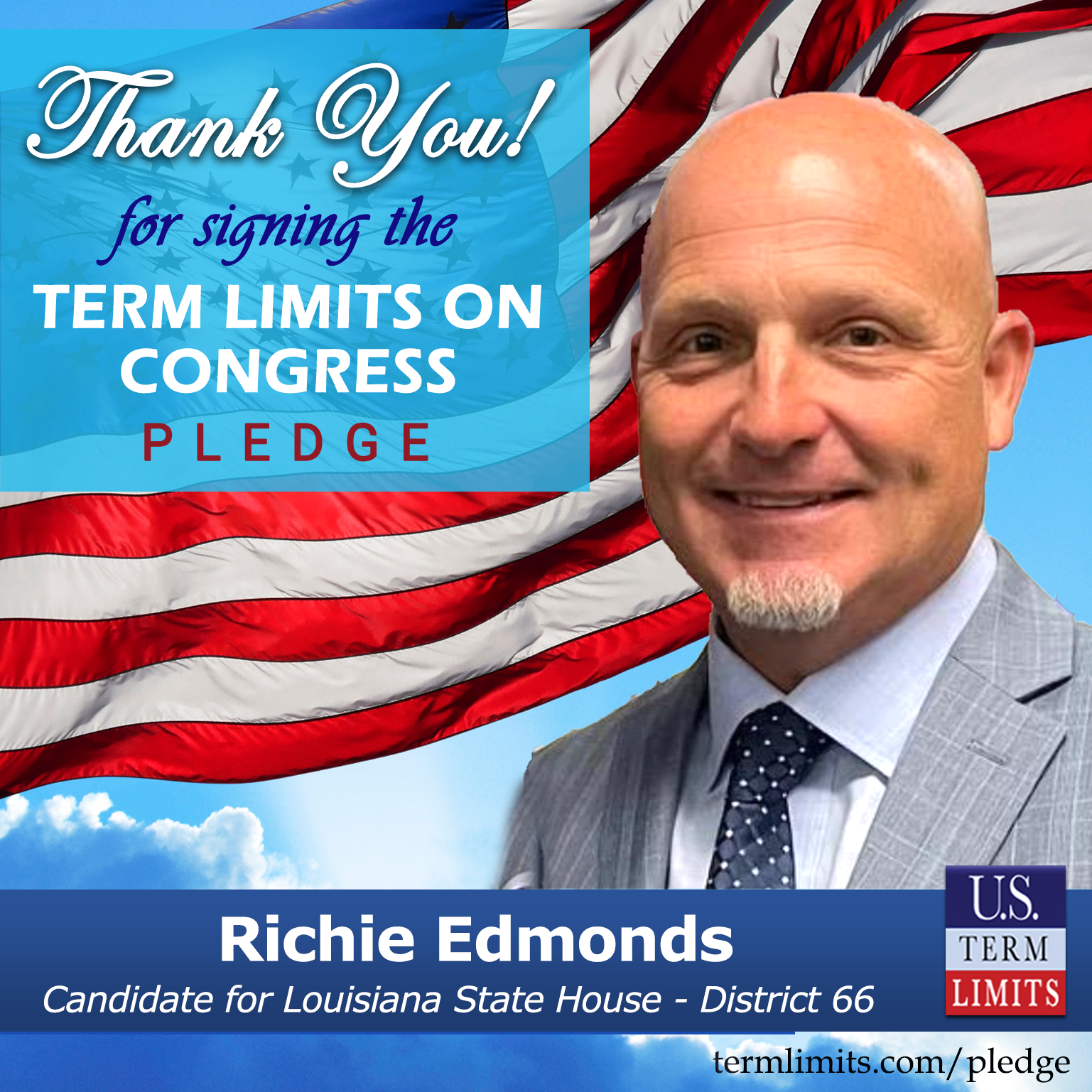 Baton Rouge, LA – U.S. Term Limits (USTL), the leader in the national, non-partisan movement to limit terms for elected officials, is gathering support from state lawmakers across the nation. Its mission is to get 34 states to apply for an amendment proposal convention specific to term limits on Congress. Louisiana state house candidate, Richie Edmonds (District 66), has committed support for term limits on Congress by signing the Term Limits Convention pledge. Previously, candidates Emily Chenevert, Hollis Day “Bubbe” and Drew Maranto also signed the pledge.