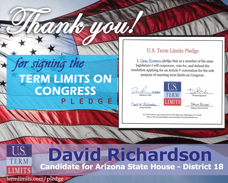 The U.S. Term Limits pledge is provided to candidates and members of state legislatures. It reads, “I pledge that, as a member of the state legislature, I will cosponsor, vote for, and defend the resolution applying for an Article V convention for the limited purpose of enacting term limits on Congress.”