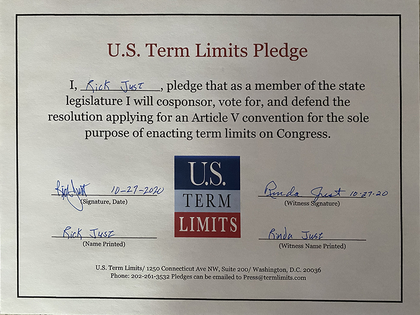 Washington, D.C. – U.S. Term Limits (USTL), the leader in the national, non-partisan movement to limit terms for elected officials, is gathering support from state lawmakers across the nation. Its mission is to get 34 states to apply for an amendment proposal convention specific to term limits on Congress. 2020 Idaho state house candidate, Rick Just (district 15), has committed support for term limits on Congress by signing the Term Limits Convention pledge. Just recently, Senator Fred Martin also signed the pledge.