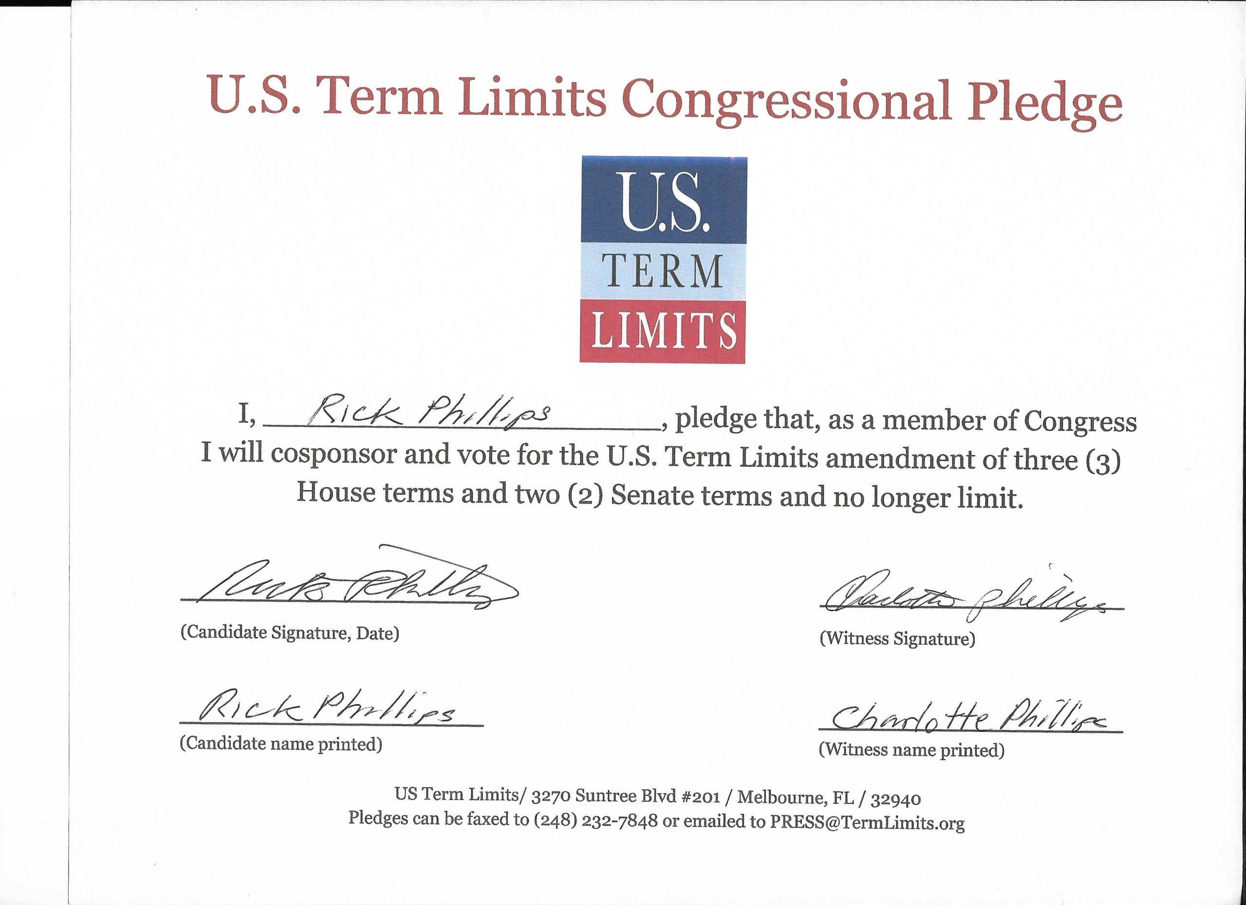 U.S. Term Limits has the support of nearly 70 pledge signers in Congress. USTL President Philip Blumel commented on Phillips’s pledge saying, “Rick’s support of term limits shows that there are individuals who are willing to put self-interest aside to follow the will of the people. America needs a Congress that will be served by citizen legislators, not career politicians.”