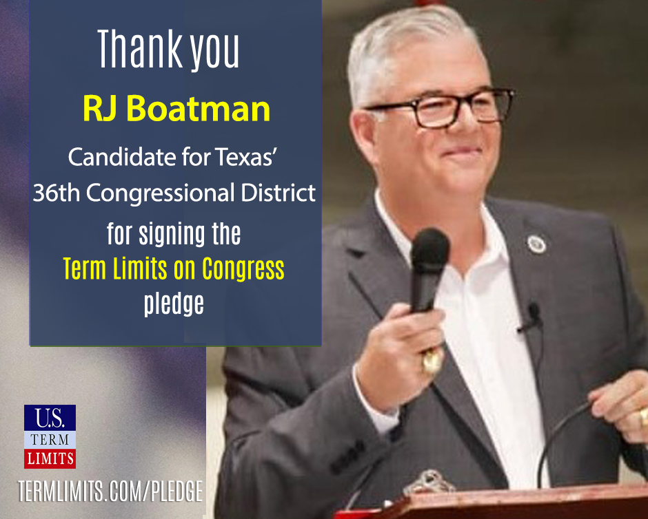 Washington, DC – U.S. Term Limits (USTL), the leader in the non-partisan national movement to limit terms for elected officials, praises candidate RJ Boatman, 2020 U.S. House candidate for Texas (district 36), for signing the pledge for an amendment to term limit Congress. Boatman is the first signer in this race. The primary election is scheduled for March 3, 2020.