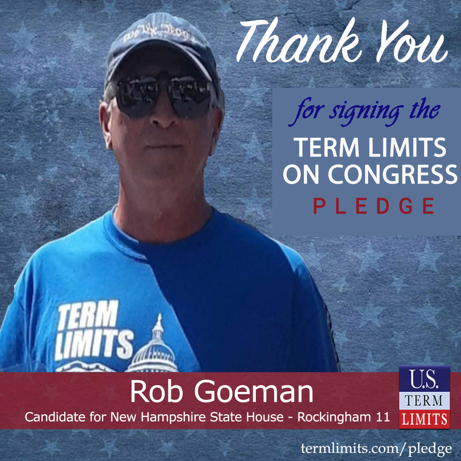 Exeter, NH – U.S. Term Limits (USTL), the leader in the national, non-partisan movement to limit terms for elected officials, is gathering support from state lawmakers across the nation. Its mission is to get 34 states to apply for an amendment proposal convention specific to term limits on Congress. New Hampshire state house candidate, Rob Goeman (Rockingham 11), has committed support for term limits on Congress by signing the Term Limits Convention Pledge.