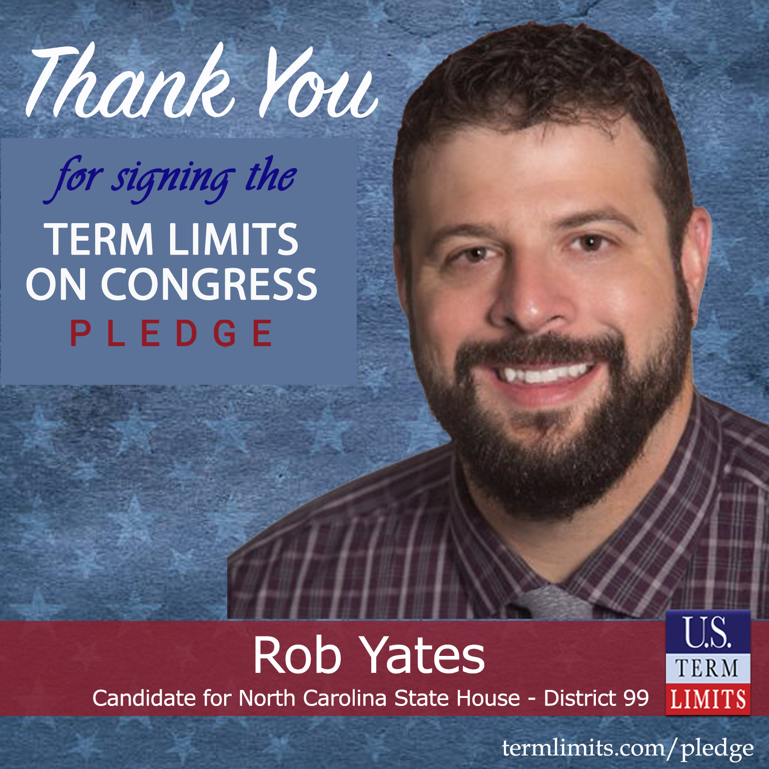 Harrisburg, NC – U.S. Term Limits (USTL), the leader in the national, non-partisan movement to limit terms for elected officials, is gathering support from state lawmakers across the nation. Its mission is to get 34 states to apply for an amendment proposal convention specific to term limits on Congress. North Carolina state house candidate, Rob Yates (district 99), has committed support for term limits on Congress by signing the term limits convention pledge.