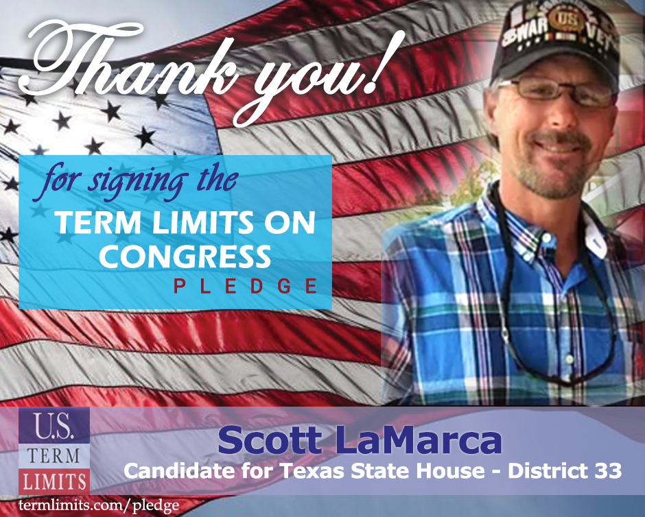 The U.S. Term Limits pledge is provided to candidates and members of state legislatures. It reads, “I pledge that, as a member of the state legislature, I will cosponsor, vote for, and defend the resolution applying for an Article V convention for the limited purpose of enacting term limits on Congress.”