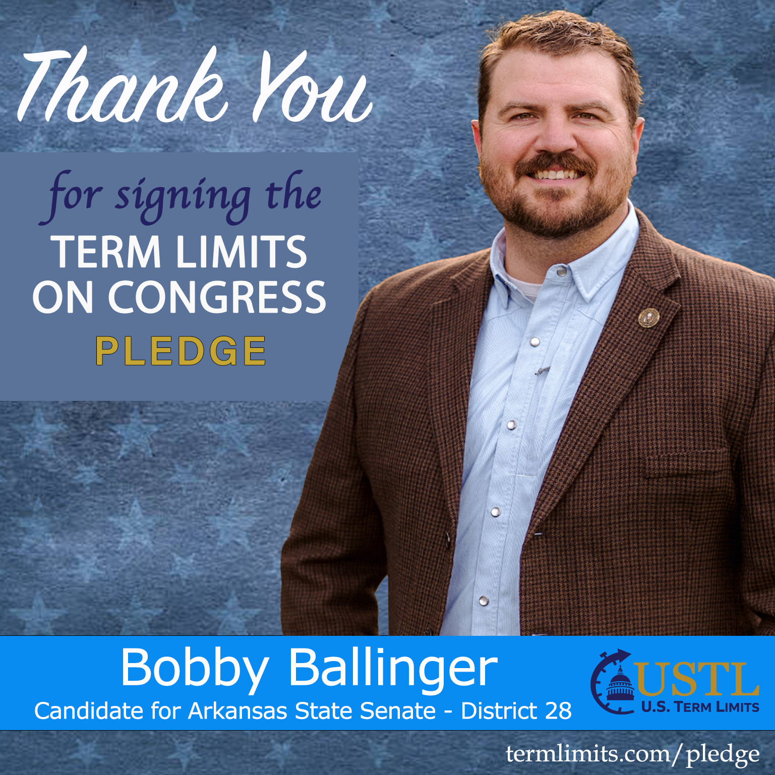 Huntsville, AR – U.S. Term Limits (USTL), the leader in the national, non-partisan movement to limit terms for elected officials, is gathering support from state lawmakers across the nation. Its mission is to get 34 states to apply for an amendment proposal convention specific to term limits on Congress. 2026 Arkansas state senate candidate, Bobby Ballinger (district 28), has committed support for term limits on Congress by signing the term limits convention pledge.