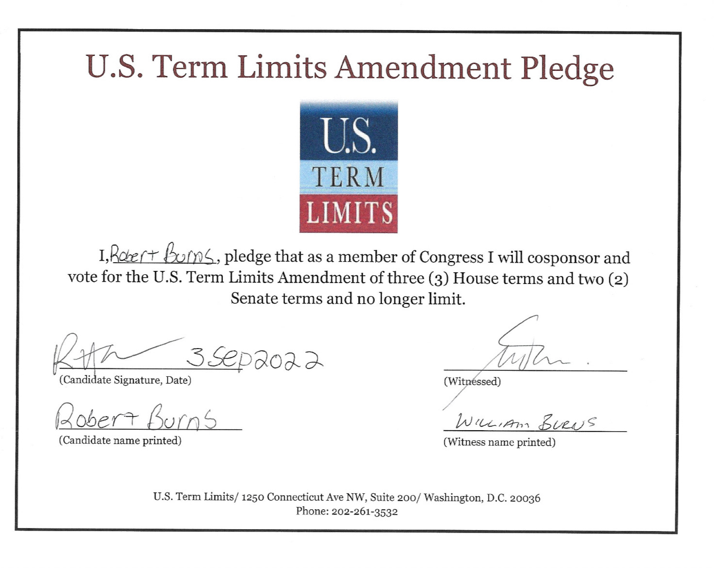 Robert Burns Pledges to Support Term Limits on Congress