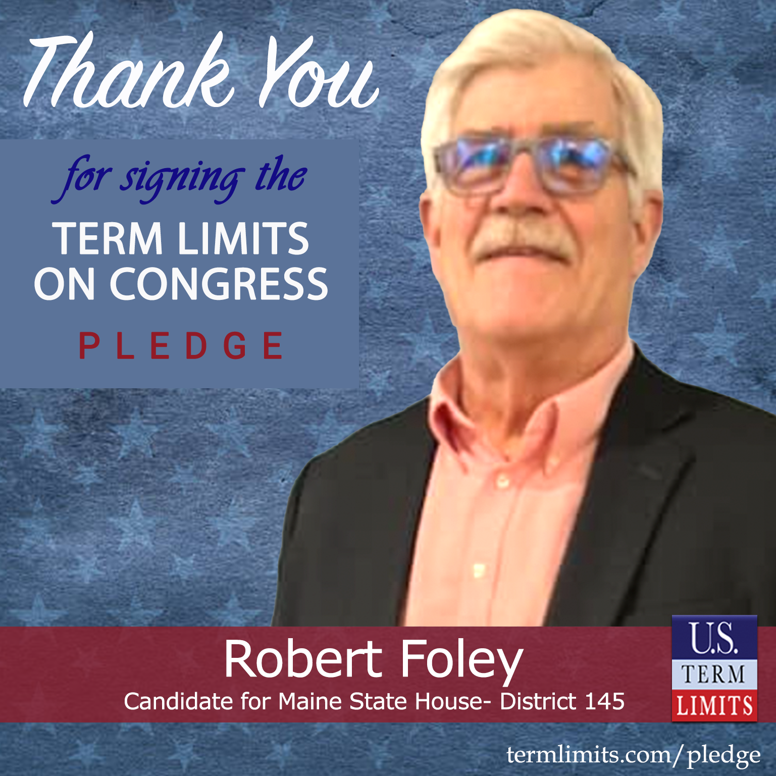Wells, ME – U.S. Term Limits (USTL), the leader in the national, non-partisan movement to limit terms for elected officials, is gathering support from state lawmakers across the nation. Its mission is to get 34 states to apply for an amendment proposal convention specific to term limits on Congress. Maine state house candidate, Robert Foley (district 145), has committed support for term limits on Congress by signing the term limits convention pledge.