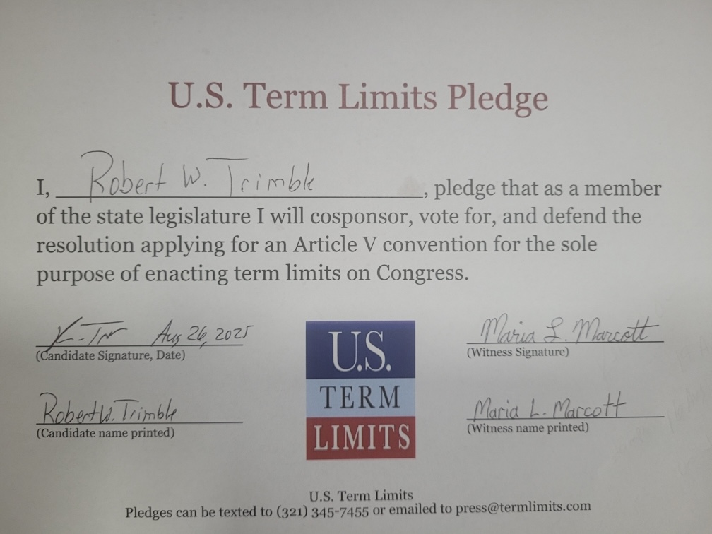 Wellston, OK – U.S. Term Limits (USTL), the leader in the national, non-partisan movement to limit terms for elected officials, is gathering support from state lawmakers across the nation. Its mission is to get 34 states to apply for an amendment proposal convention specific to term limits on Congress. 2026 Oklahoma state senate candidate, Robert Trimble (district 28), has committed support for term limits on Congress by signing the term limits convention pledge.