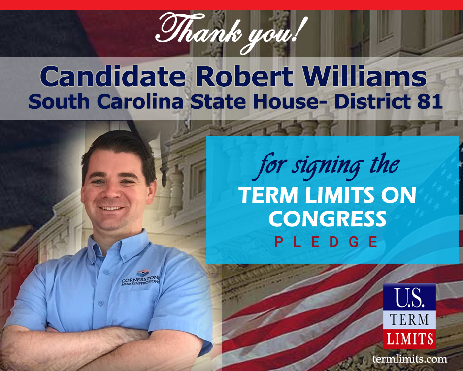 Washington, D.C. – U.S. Term Limits (USTL), the leader in the national, non-partisan movement to limit terms for elected officials, is gathering support from state lawmakers across the nation. Its mission is to get 34 states to apply for an amendment proposal convention specific to term limits on Congress. 2020 South Carolina state house candidate Robert Williams (district 81), has committed support for term limits on Congress by signing the Term Limits Convention pledge. Williams is the first signer is this race. The primary election is scheduled for June 9, 2020.