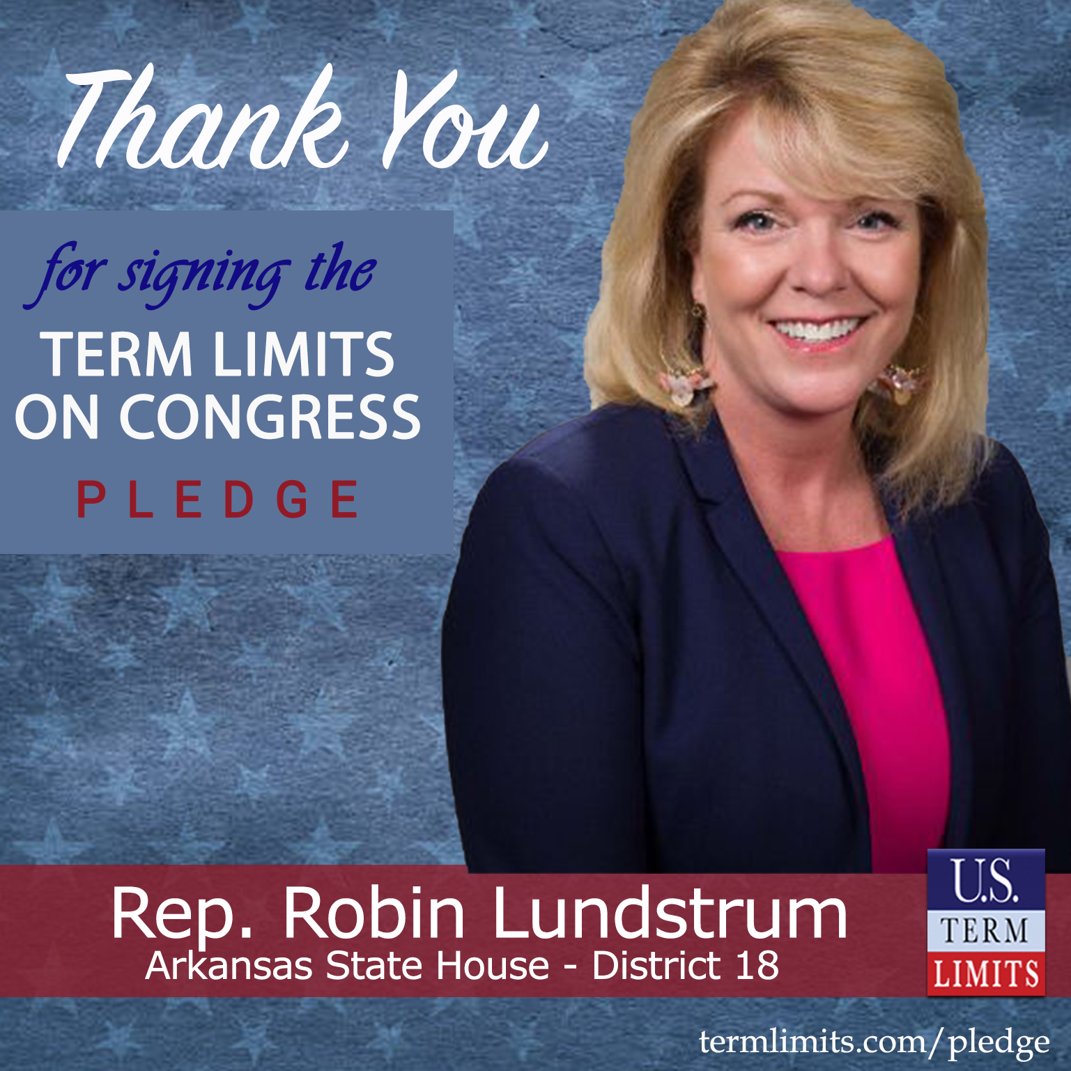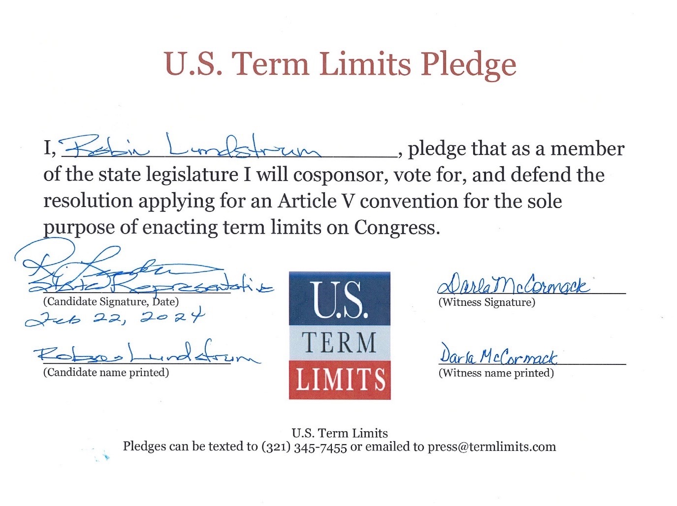 USTL President, Philip Blumel, commented on Lundstrum’s pledge saying, “Robin’s strong support of term limits shows that there are individuals who are willing to listen to the majority of voters who want term limits. America needs a Congress that will be served by citizen legislators, not career politicians.”